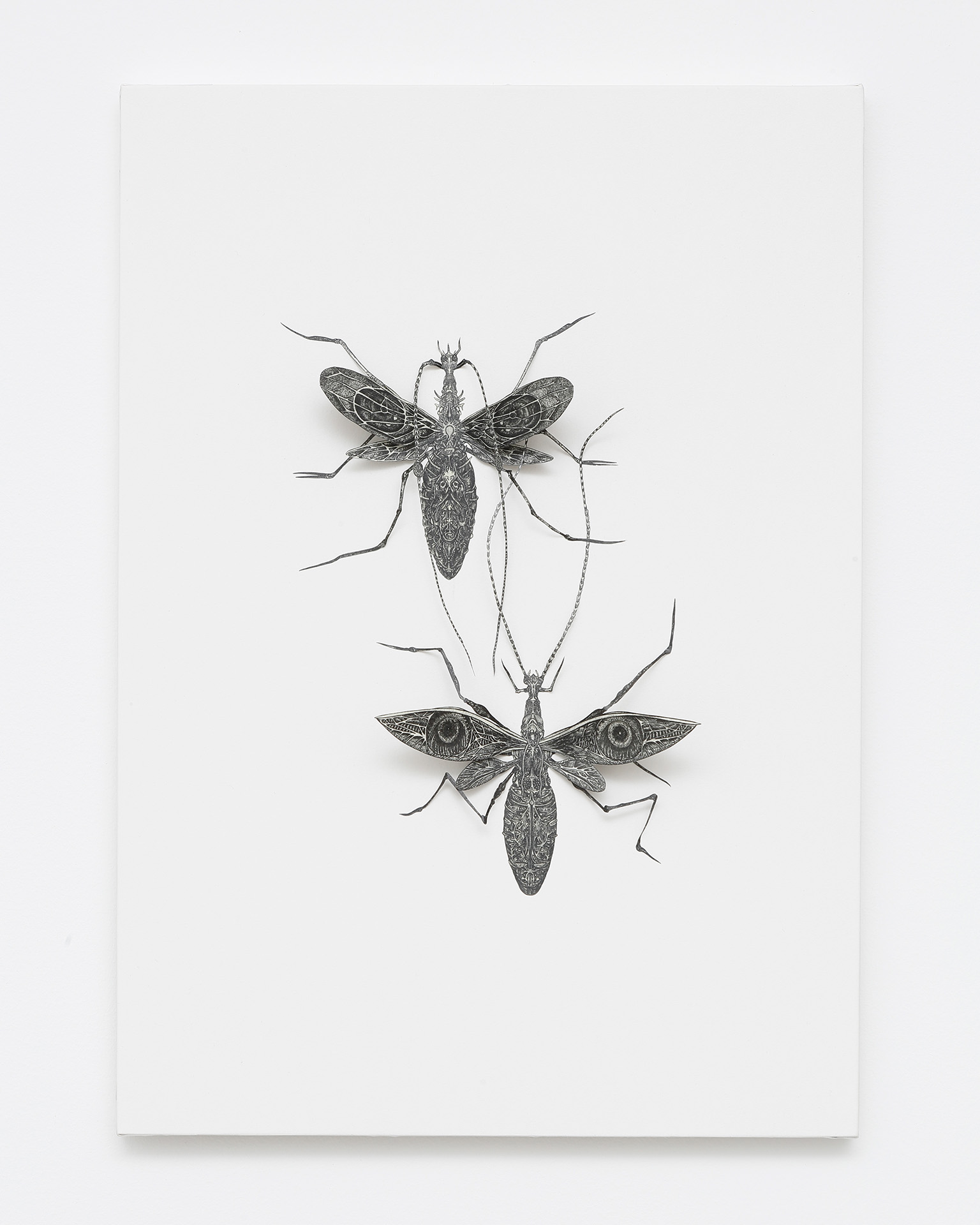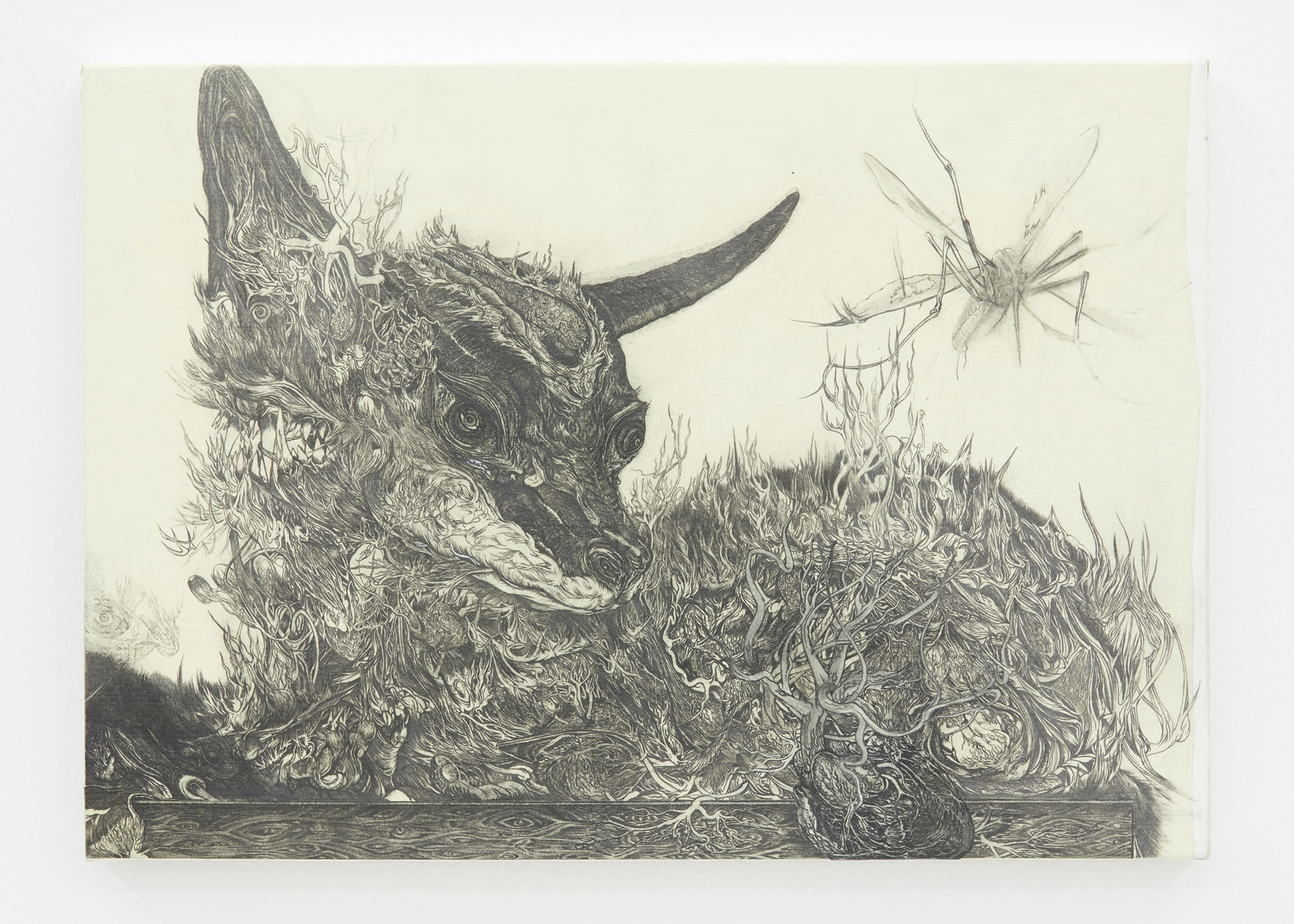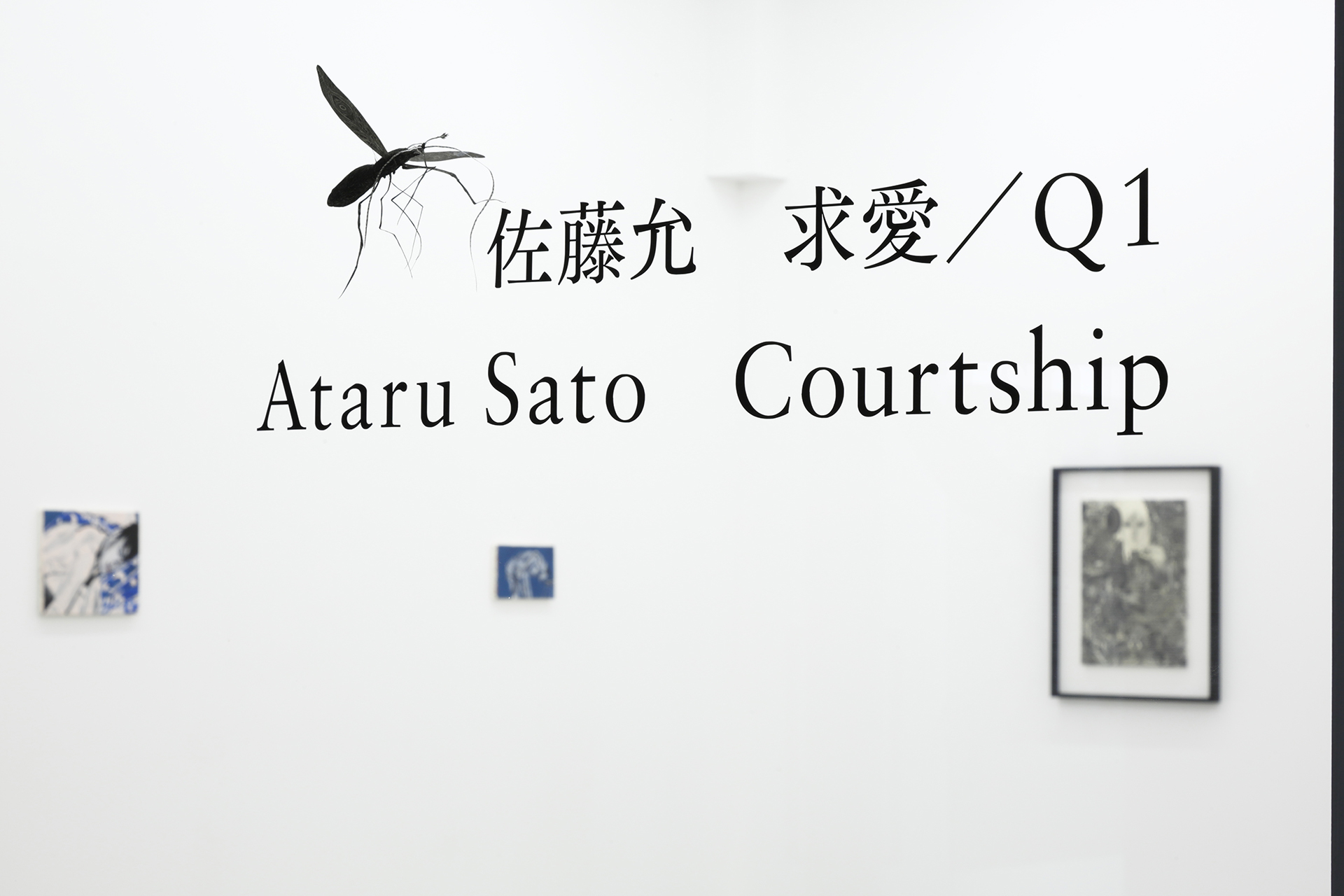 本展のタイトルにある「Q1」には複数の意味が含まれています。「求愛」としての「Q1」、そして「問1」としての「Q1」。今年の3月11日、6年前に震災があった同時刻に、2匹の虫が恐れながら互いに近づきあおうとしている場面を描いた作品が偶然完成しました。「求愛」はその作品によって佐藤の頭に浮かんだ言葉で、現在の彼の表現活動において重要なキーワードだと感じたと言います。