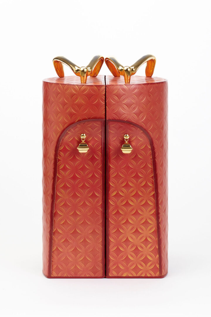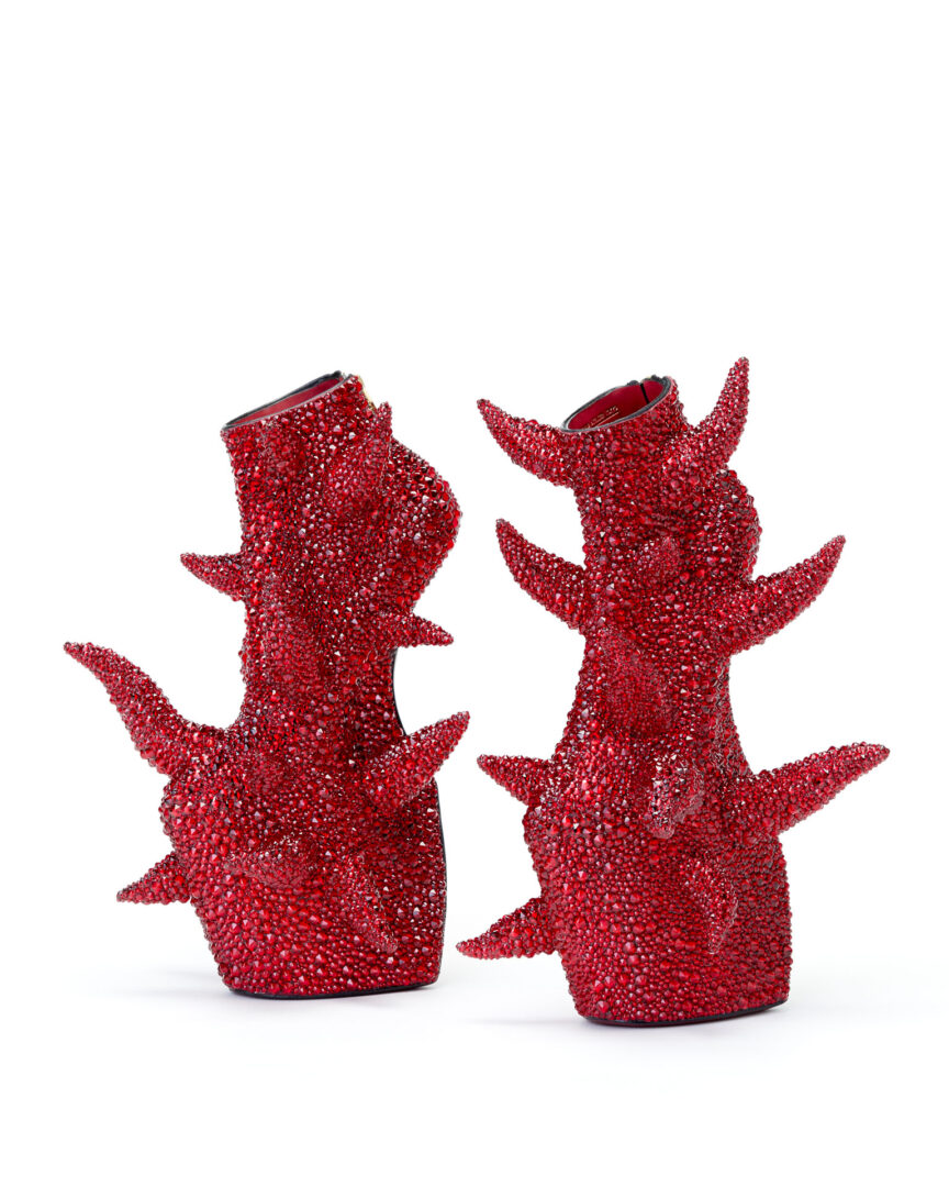 舘鼻則孝は、日本古来の文化的に価値のある部分と、現代の要素を組み合わせることで、新たな視点と世界観を提示します。俯瞰的な視野を持ちつつ、詳細を徹底的に掘り下げる。それが工芸的な手仕事で精緻に完成された作品として表現されます。歴史、そのなかで育まれてきた独特の美学、文化や思想。それらを再考することで未来への可能性を示す舘鼻の作品は世界で高く評価され、遊女が履く高下駄から着想を得た代表作「ヒールレスシューズ」等の作品が、ニューヨークのメトロポリタン美術館やロンドンのヴィクトリア&アルバート博物館などに収蔵されています。