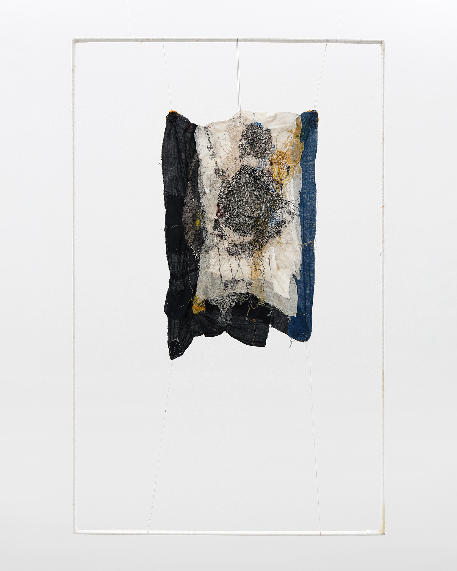 Junko Oki engraves stories of life onto textiles, with each stitch placed meticulously by hand. Without the guide of an underdrawing, she creates unique motifs and patterns by freehand stitching and by rejecting the structured tradition of embroidery. Although her works display seemingly rudimentary techniques, the artist’s instinctive approach awakens a visceral reaction in viewers. Through her unique embroidery and careful attention, Junko Oki breathes new life into aged textiles, frames, and other objects. These objects, with years of stories already embedded into them, are revived by Oki’s hand through a series of attentive stitches. They include everything that came into being, and chronologies that once existed but are now gone. At the core of Oki’s creative process is a discovery of new horizons through layered impressions of time.