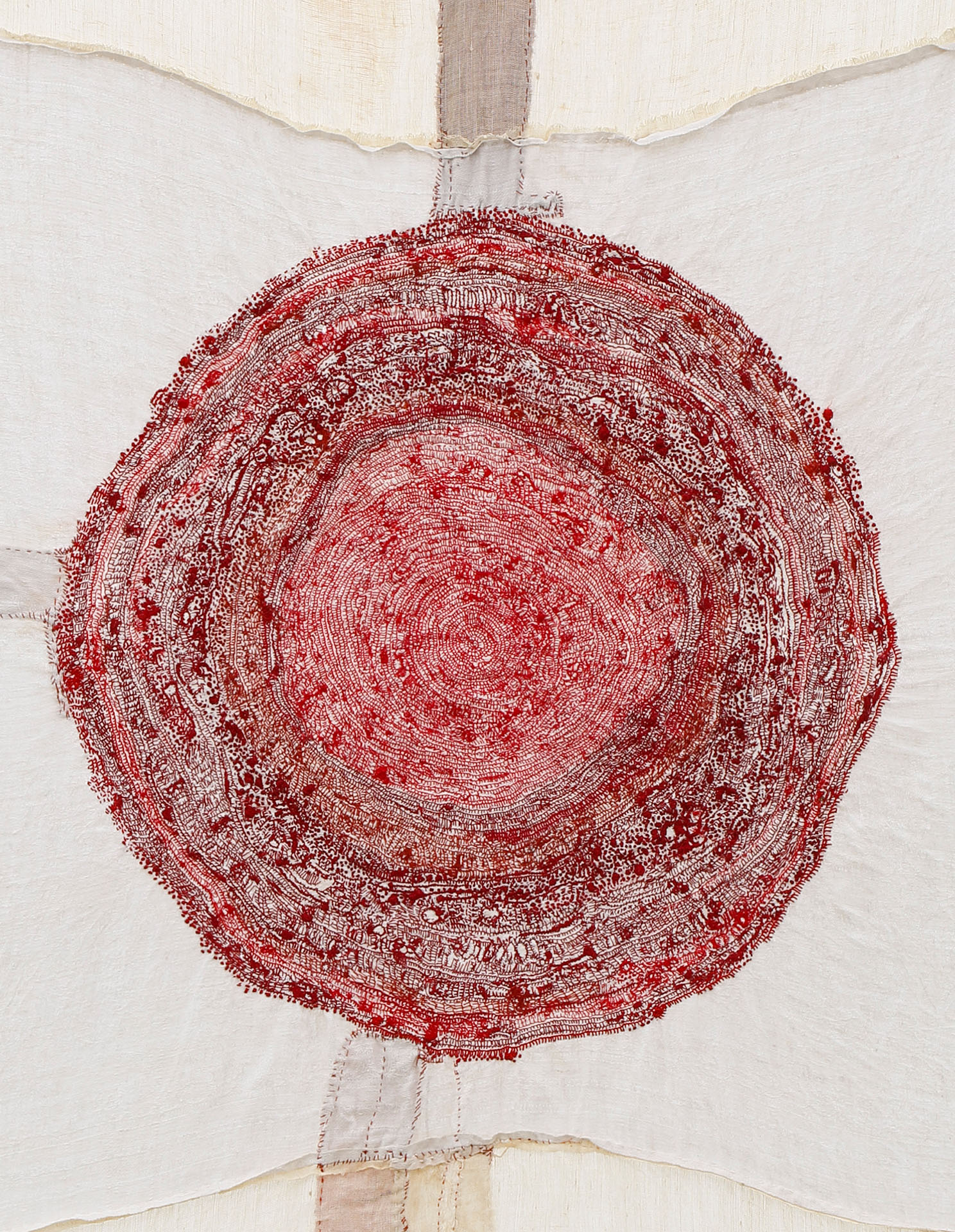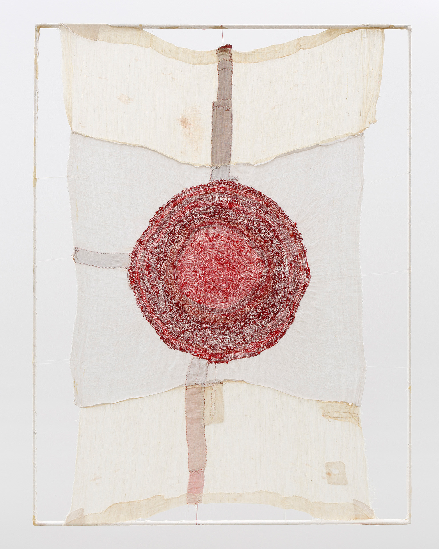 Junko Oki engraves stories of life onto textiles, with each stitch placed meticulously by hand. Without the guide of an underdrawing, she creates unique motifs and patterns by freehand stitching and by rejecting the structured tradition of embroidery. Although her works display seemingly rudimentary techniques, the artist’s instinctive approach awakens a visceral reaction in viewers. Through her unique embroidery and careful attention, Junko Oki breathes new life into aged textiles, frames, and other objects. These objects, with years of stories already embedded into them, are revived by Oki’s hand through a series of attentive stitches. They include everything that came into being, and chronologies that once existed but are now gone. At the core of Oki’s creative process is a discovery of new horizons through layered impressions of time.