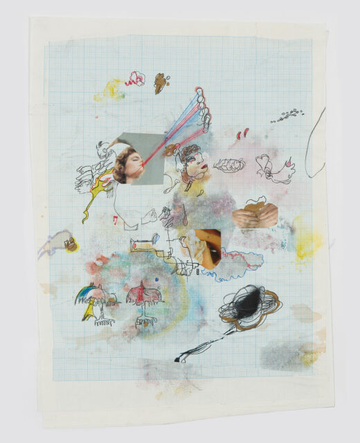 Acrylic, color pencil, pencil, ink, paper collage on paper