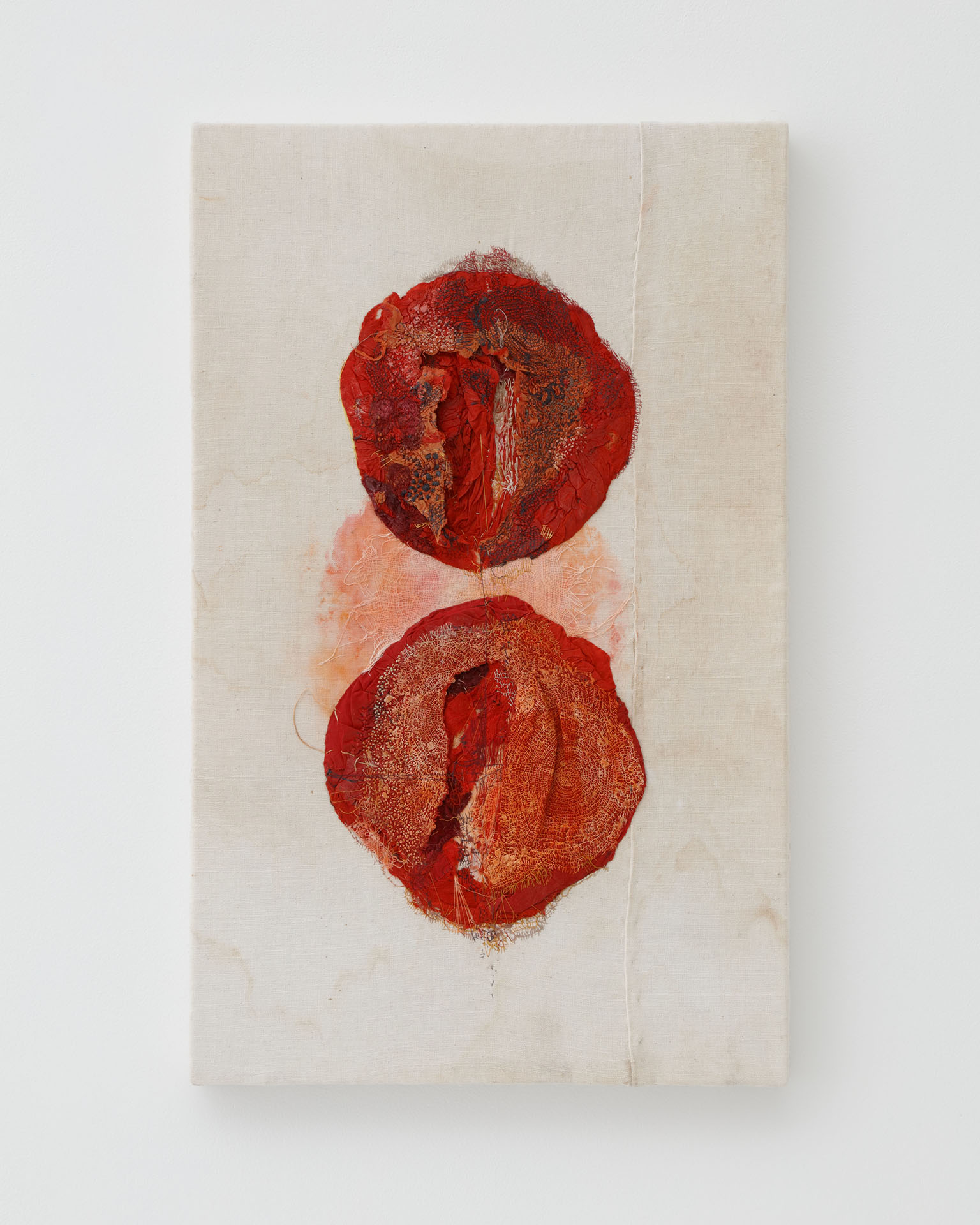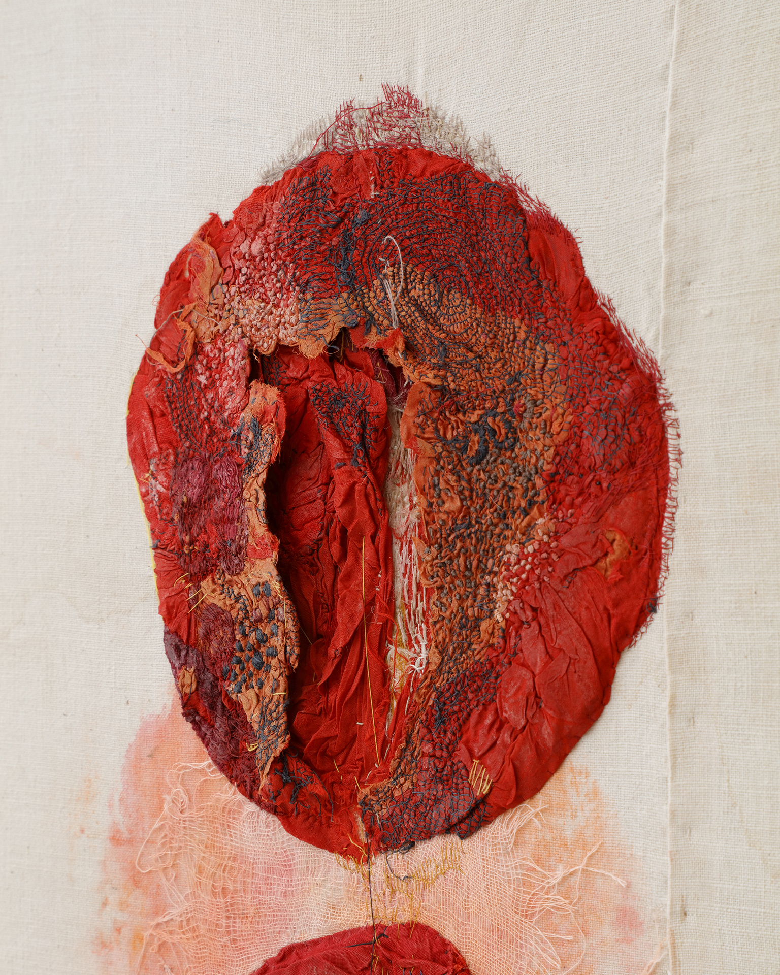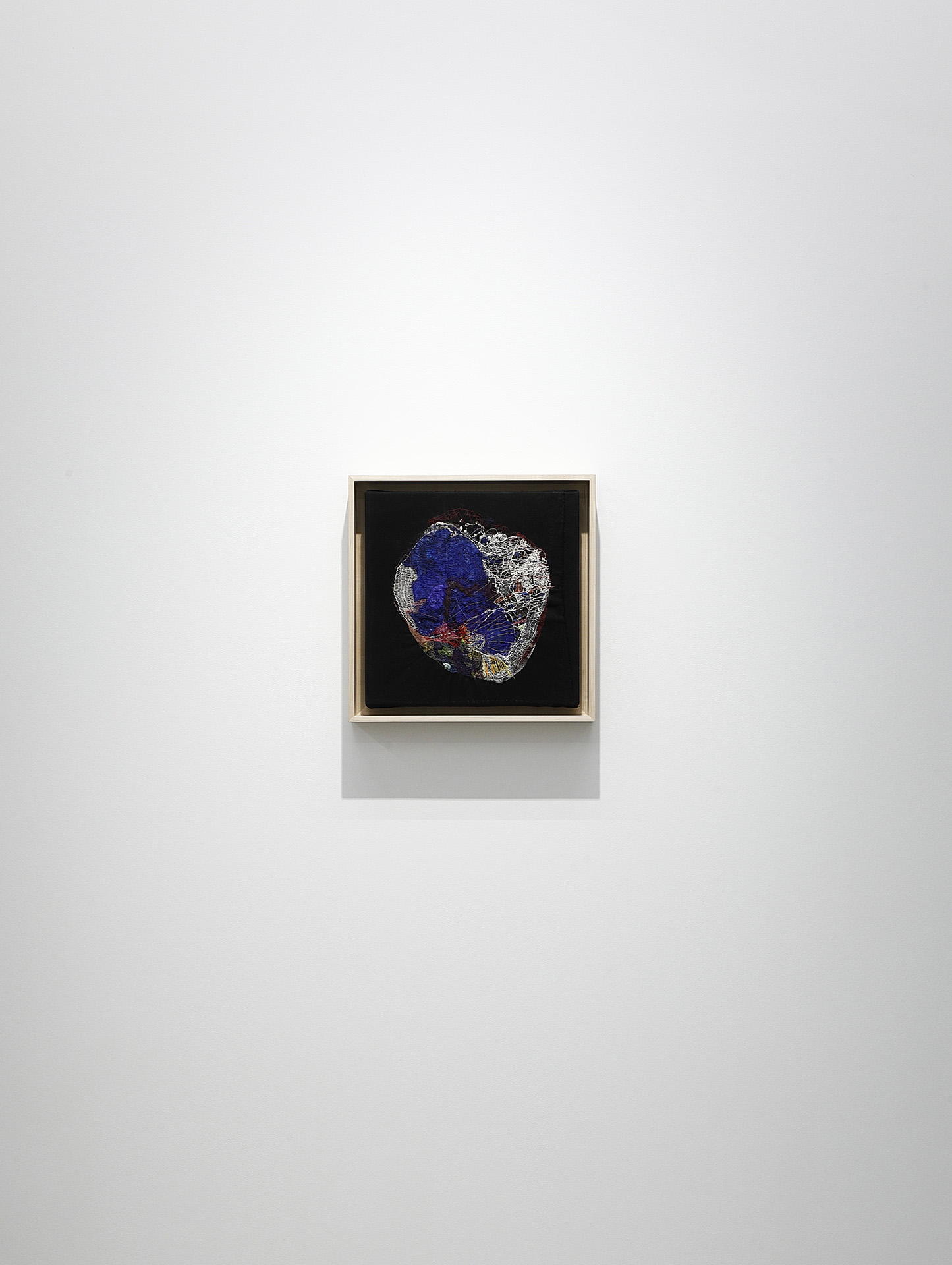 Junko Oki engraves stories of life onto textiles, with each stitch placed meticulously by hand. Without the guide of an underdrawing, she creates unique motifs and patterns by freehand stitching and by rejecting the structured tradition of embroidery. Although her works display seemingly rudimentary techniques, the artist’s instinctive approach awakens a visceral reaction in viewers. Through her unique embroidery and careful attention, Junko Oki breathes new life into aged textiles, frames, and other objects. These objects, with years of stories already embedded into them, are revived by Oki’s hand through a series of attentive stitches. They include everything that came into being, and chronologies that once existed but are now gone. At the core of Oki’s creative process is a discovery of new horizons through layered impressions of time.