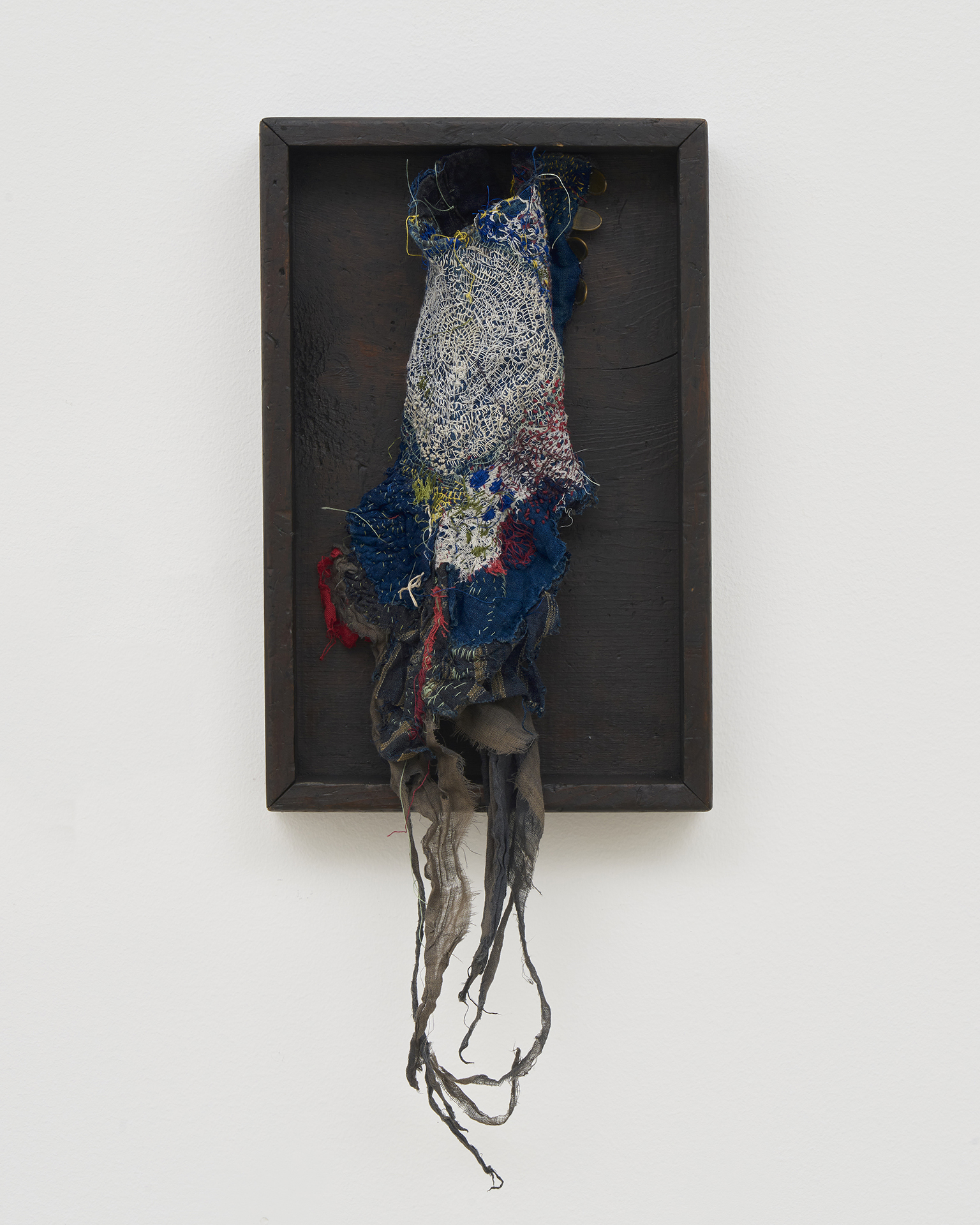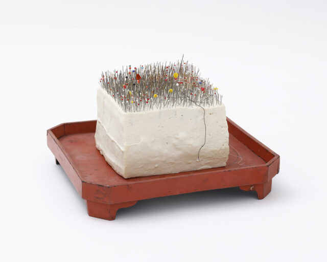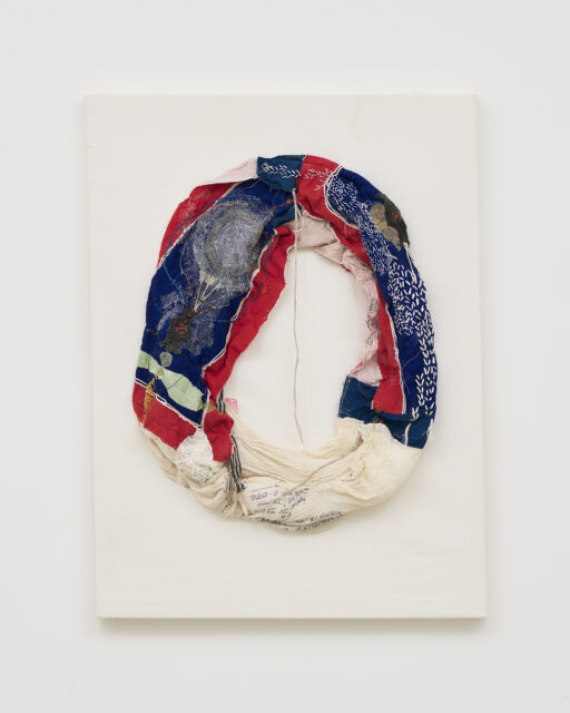 Through unique embroidery and careful attention, Junko Oki inserts new life into used textiles and instruments. These objects, with years-worth of stories already engraved into them, are revived by Okiʼs hand through a series of attentive stitches. In Aichi Triennale 2025, Oki presented an installation work incorporating 100,000 needles gathered from throughout Japan, evoking the histories of hari-kuyo and sennin bari. In the current exhibition “Roppongi Crossing: What Passes is Time. We are Eternal” at the Mori Art Museum, Oki is showing a selection of recent works including pieces that rework items from her personal collection of fabrics and have significant sentimental value.