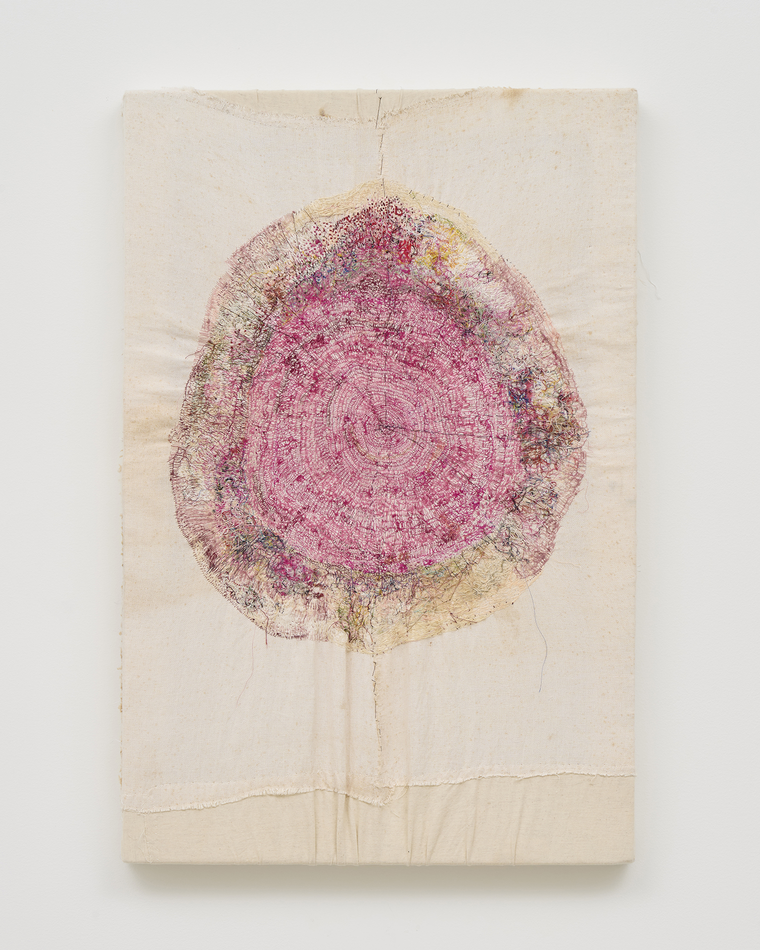 Presenting some of her largest work to date, working with large and unique materials has prompted the artist to recalibrate her process, sketching on an image of the material and making overlapping stitches to resemble brushstrokes. The dialogue with the material is unique to each piece of material involved, and Oki refers to this process as an intertwining of new and old times. They include everything that came into being, and chronologies that once existed but are now gone. At the core of Oki’s creative process is a discovery of new horizons through layered impressions of time.