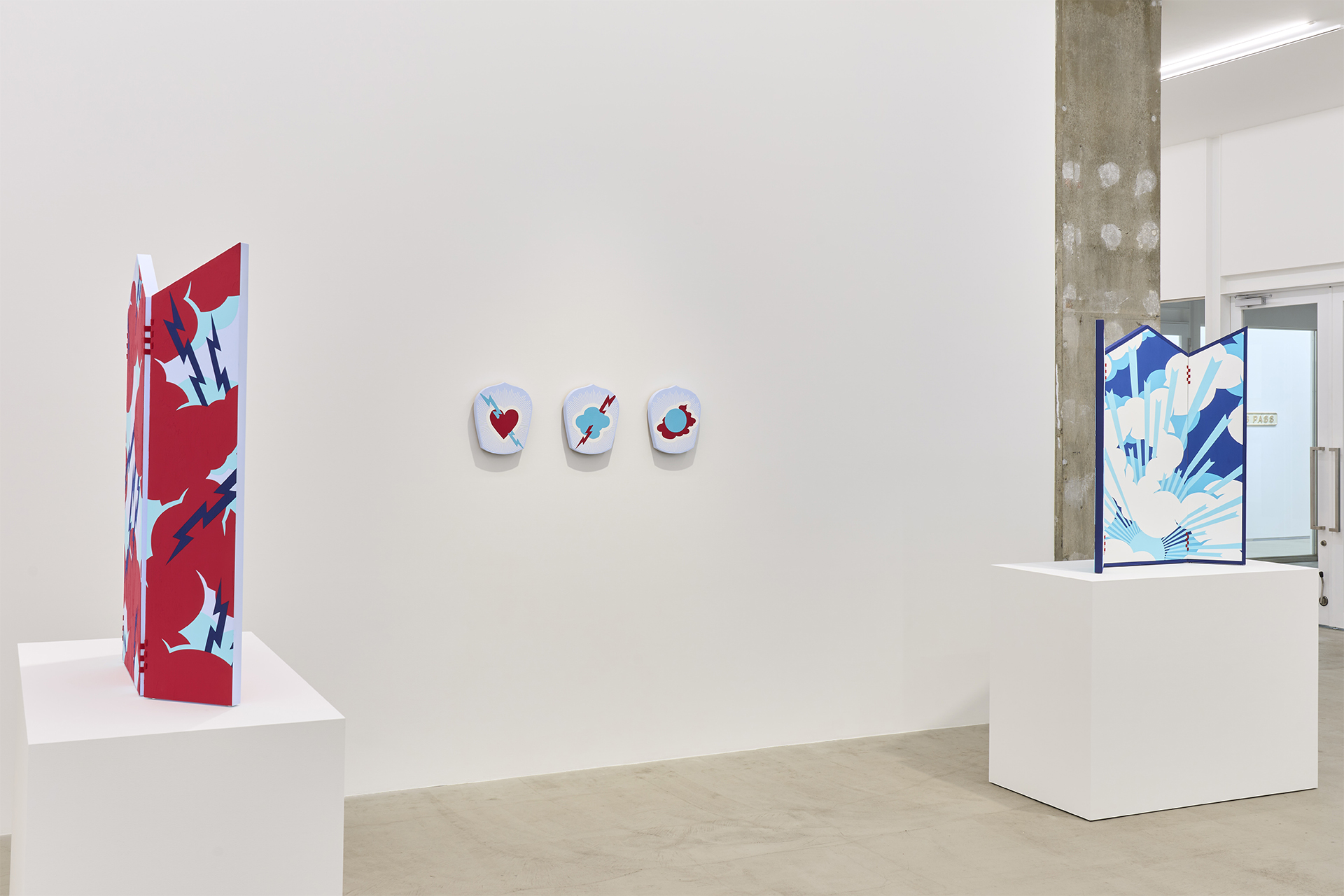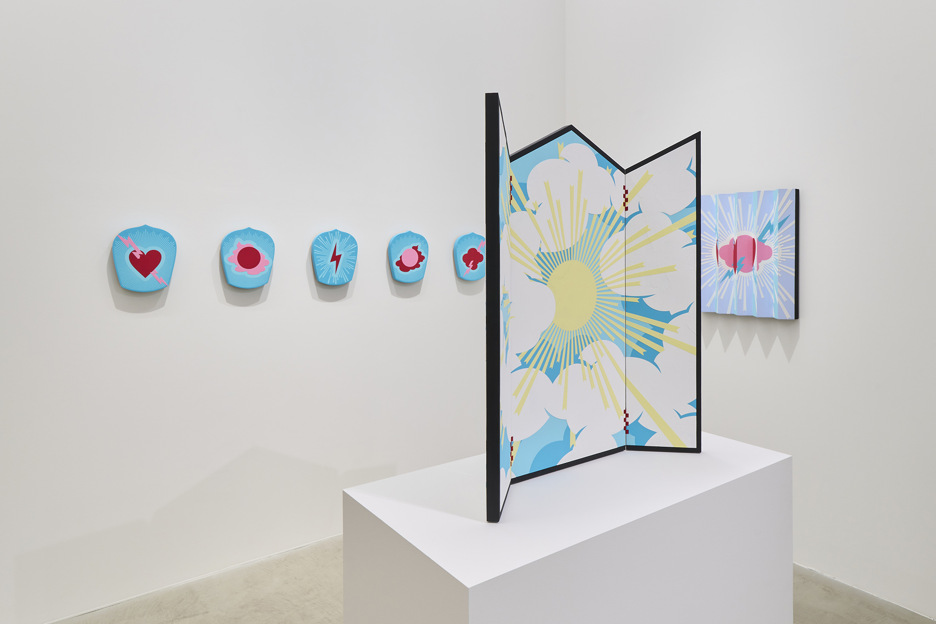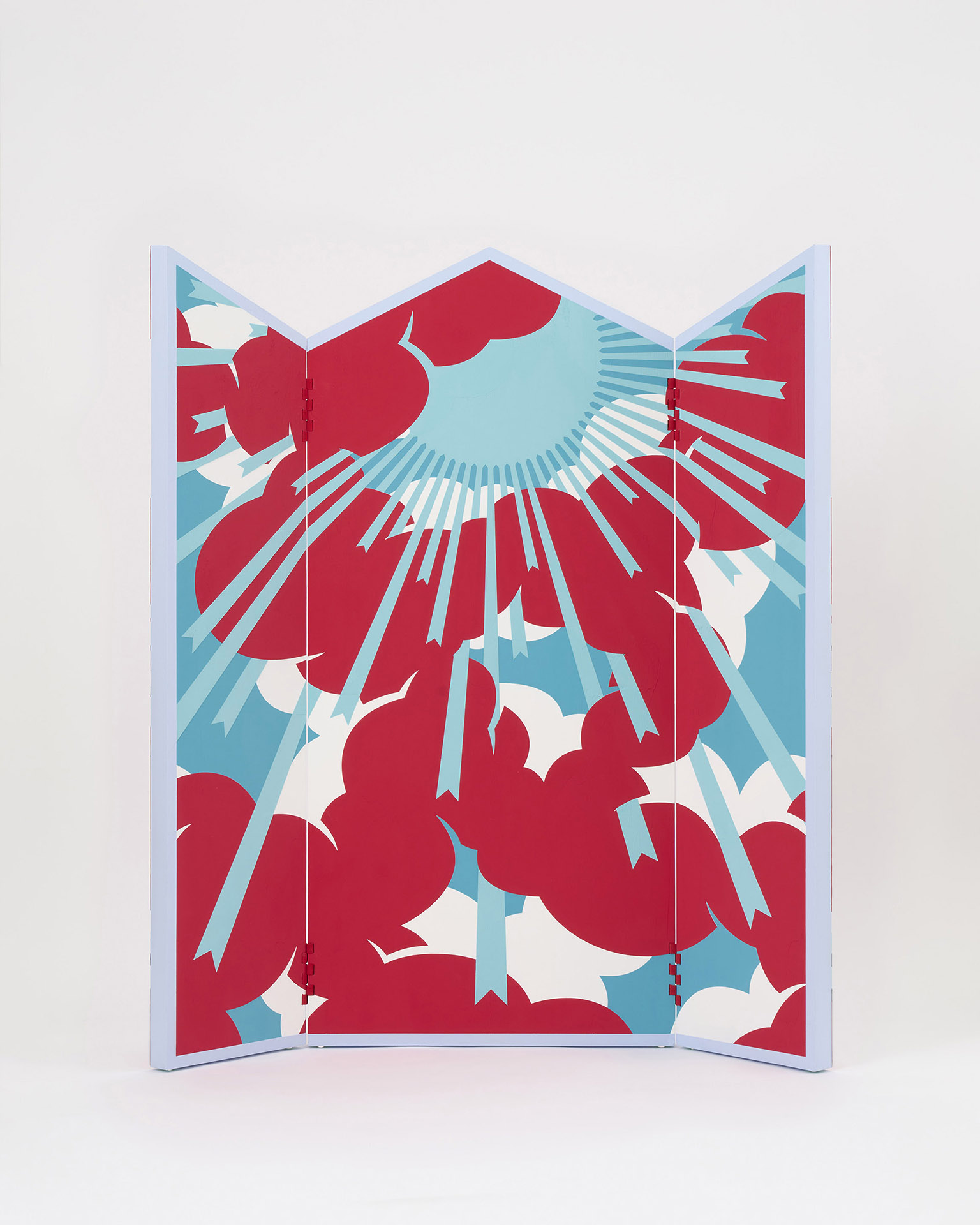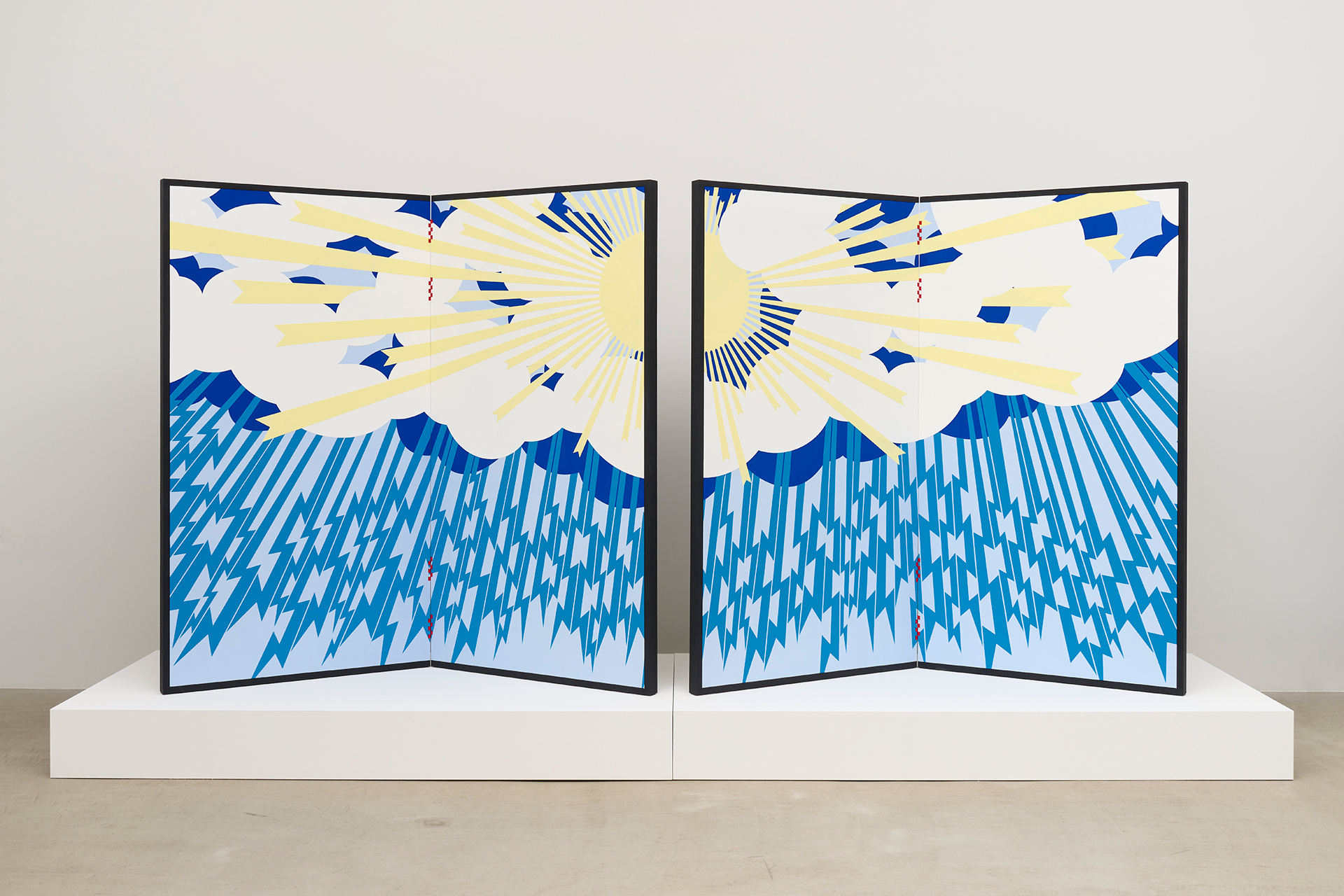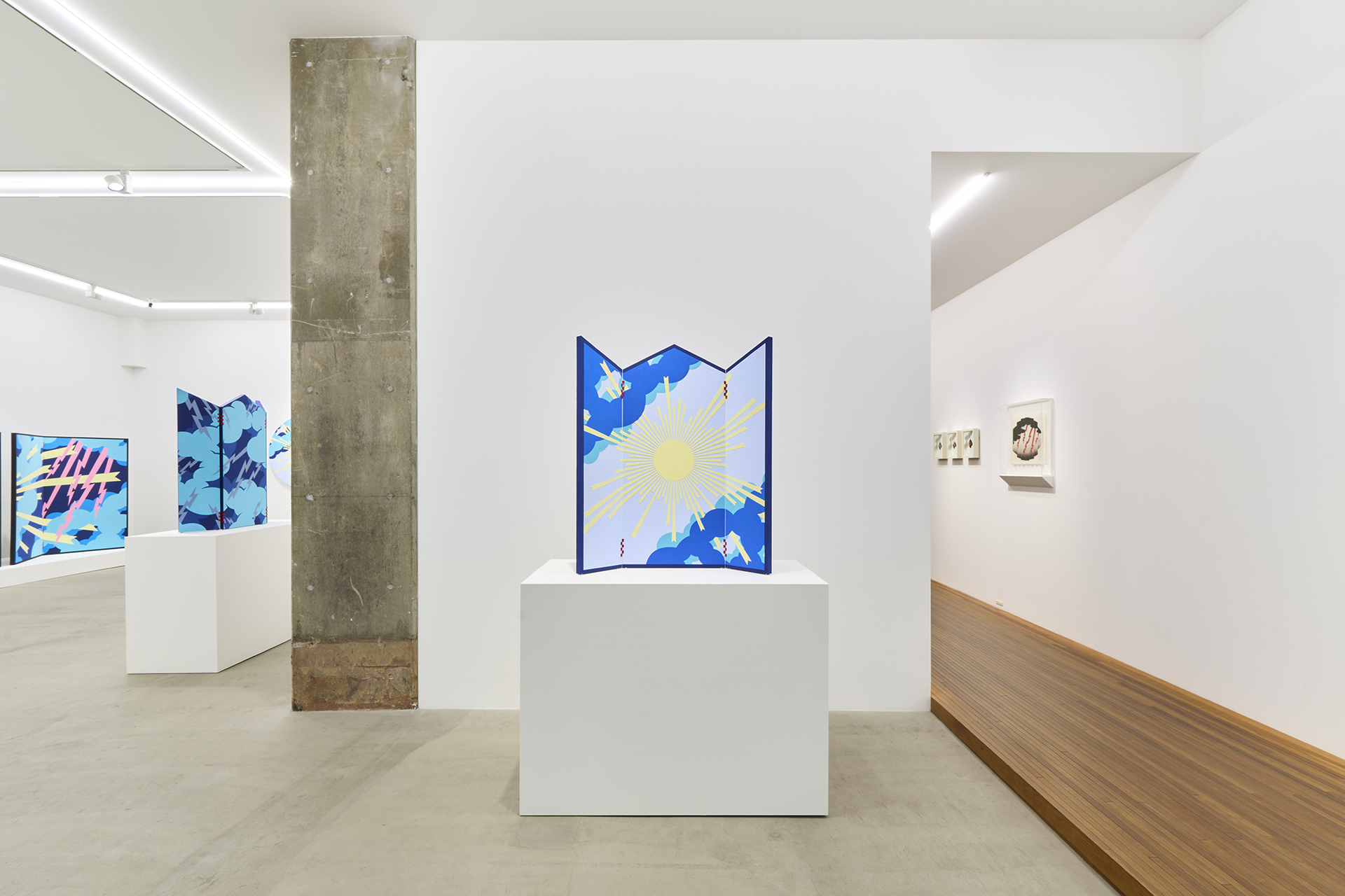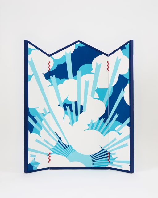 In this, the artist’s ninth solo exhibition with the gallery, Tatehana echoes past themes by presenting work that reflects on value systems drawn from an examination and re-interpretation of Japanese culture from a modern perspective. In particular, the central piece of the exhibition, “Descending Painting (Double Doors),” is a seigan triptych that focuses on the methodological concept of binary homogeneity and Shinto-Buddhist syncretism.