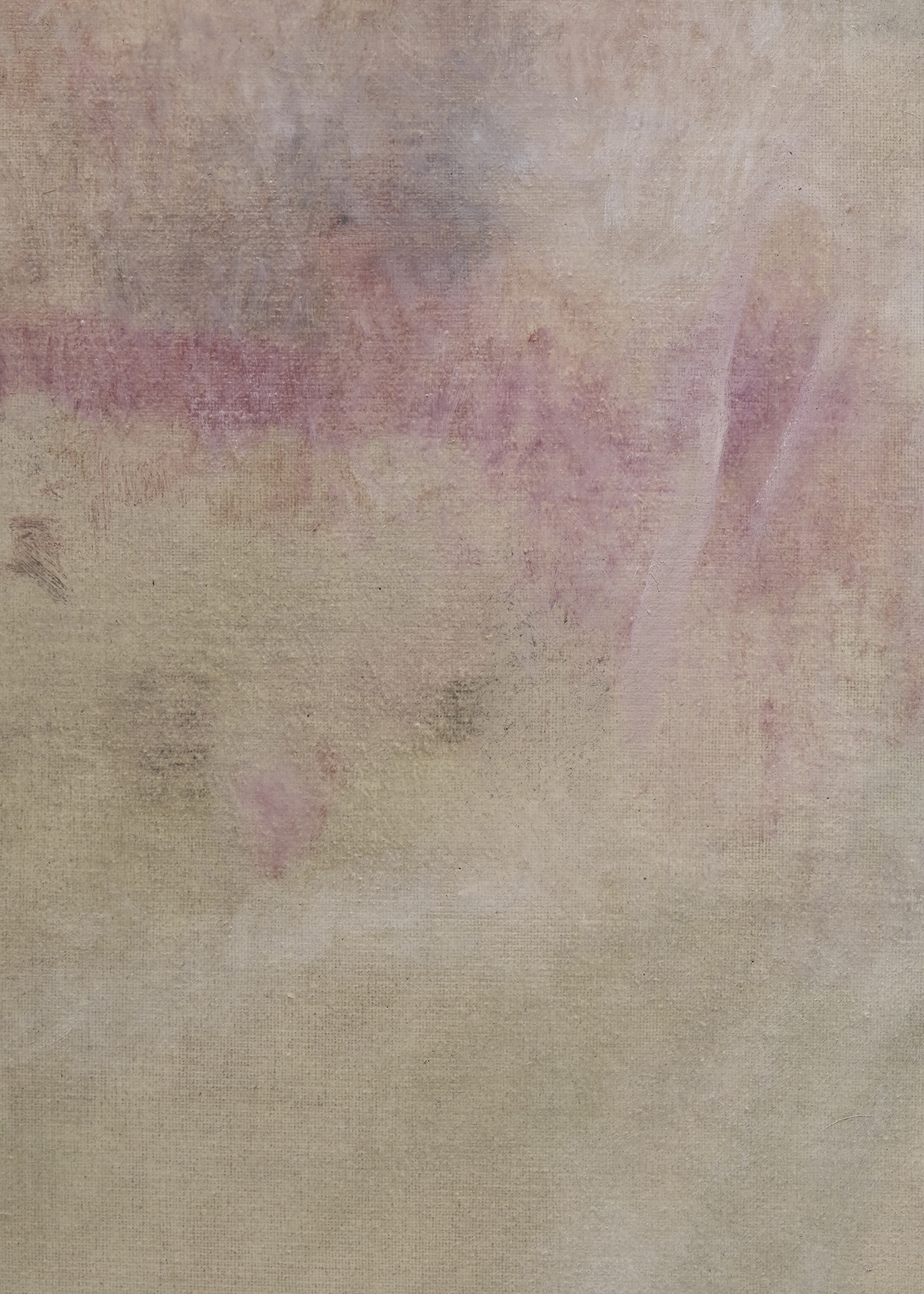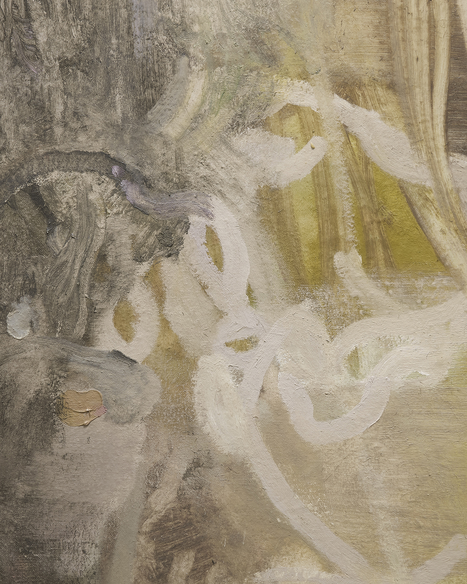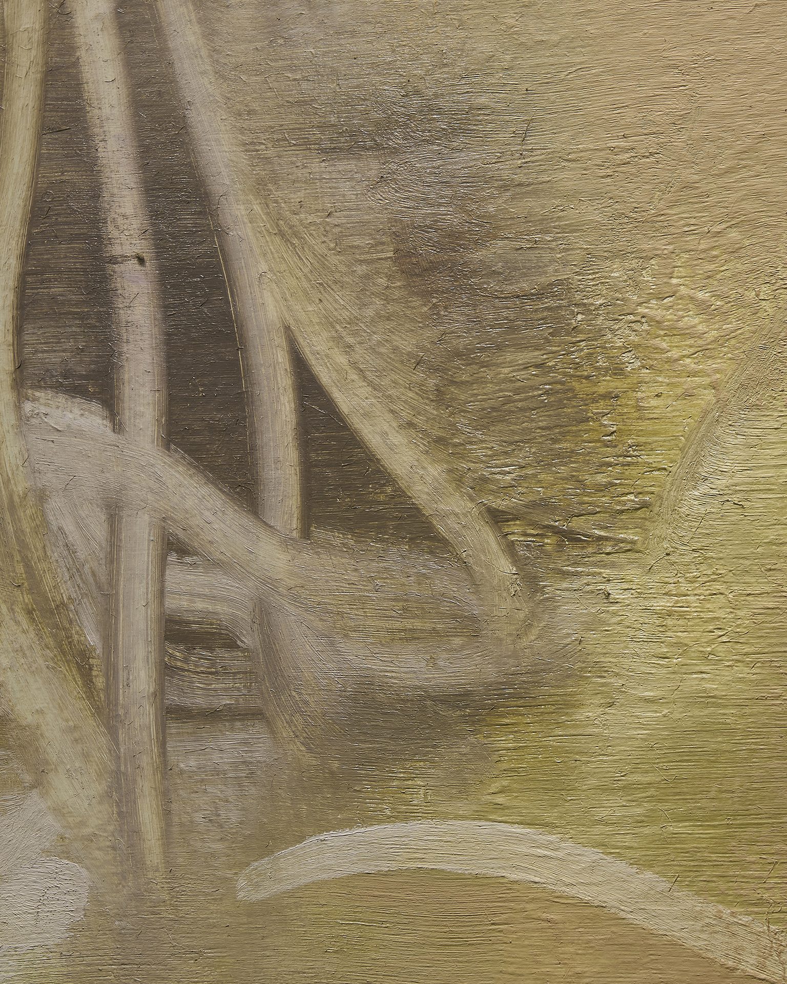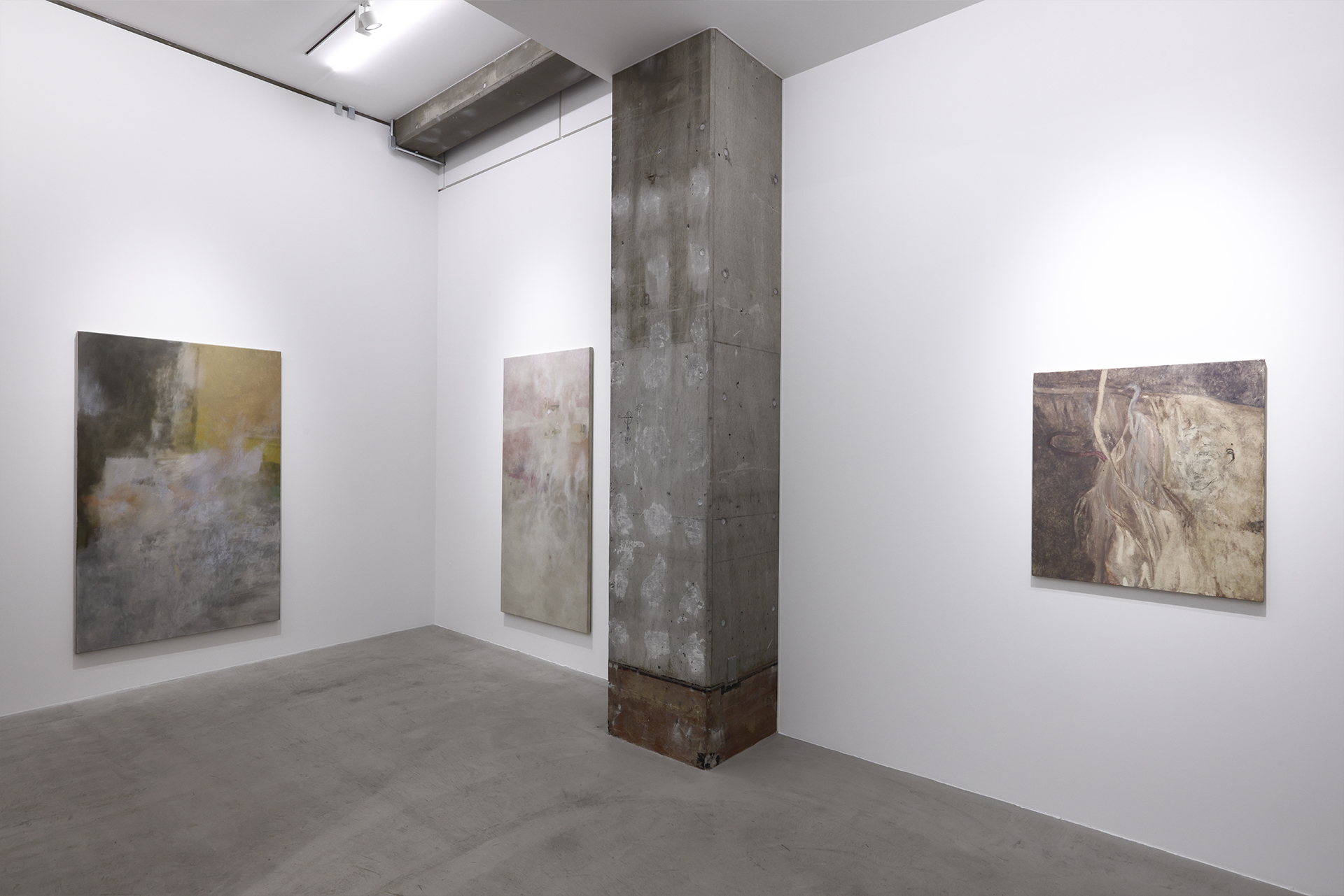 朝長の作品を近くで観ると、絵肌が独特なのがすぐ理解できます。 ヌルっとしていたり、ざらついていたり、強い拘りが感じられます。物理的な厚みはありませんが、筆で叩き上げたり、絵具を練り込んだり重ねたりしながら、深みのある絵肌が生まれています。画面の上で脈を打ち、呼吸しているような生々しさがあり、どこか消滅に向かうような印象も受けますが、決してささやかではありません。作品を実際に観ることで、画面で観る以上にその強さを感じるでしょう。