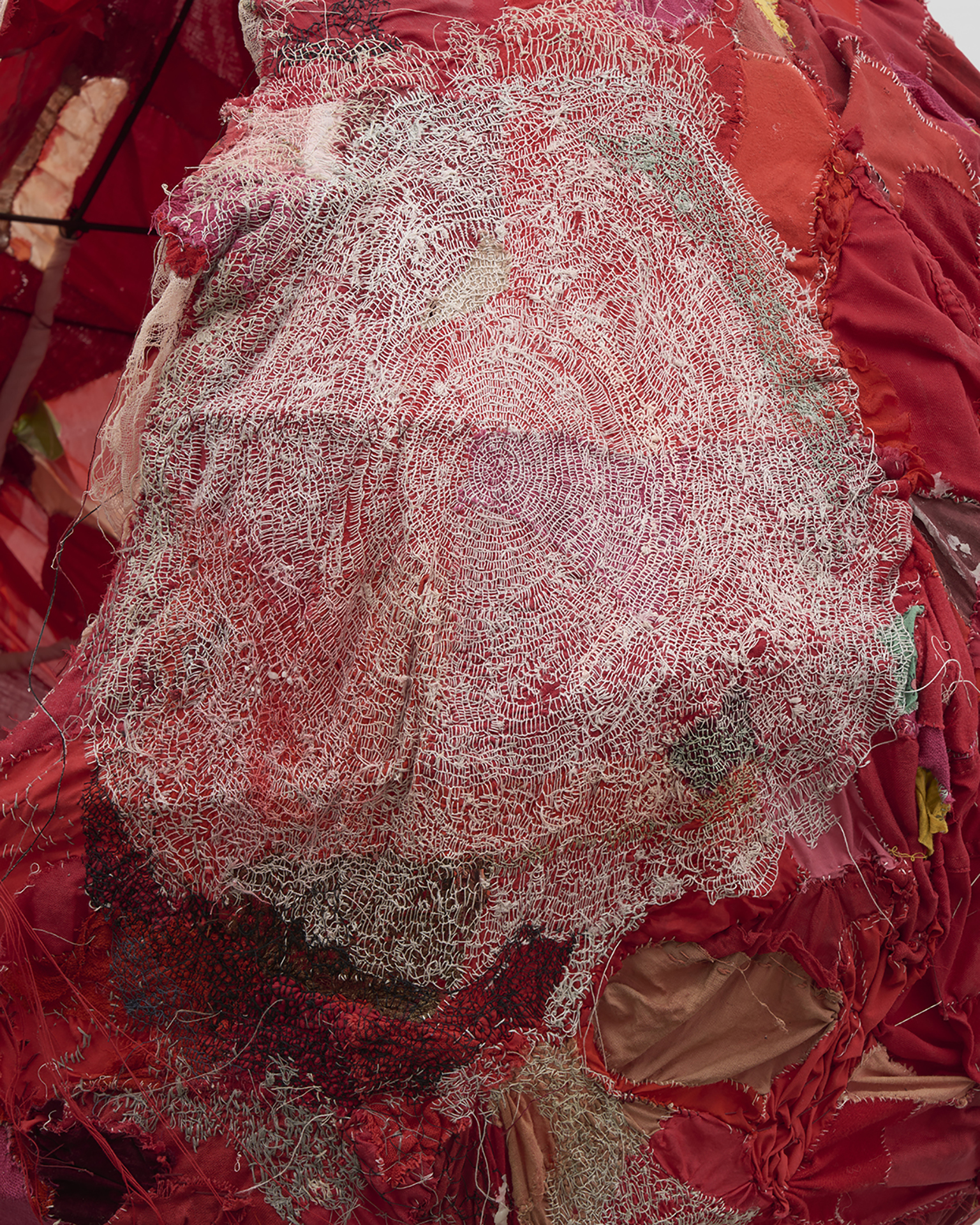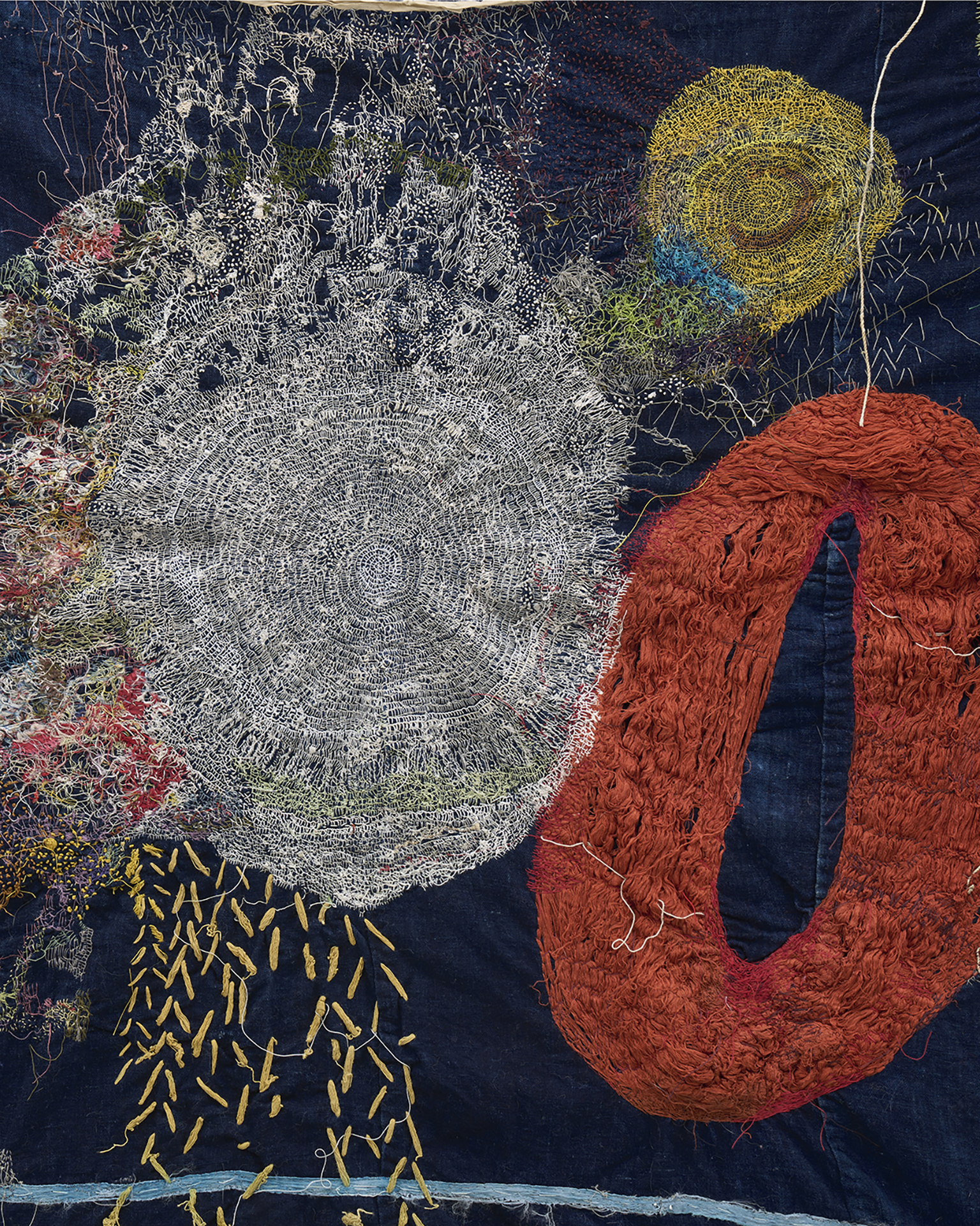 沖潤子は、古い布や道具が経てきた時間、またその物語の積み重なりに、刺繍と彼女自身の時間の堆積を刻み込み、紡ぎ上げることで、新たな生と偶然性を孕んだ作品を発表してきました。昨年の国際芸術祭「あいち2025」では、全国から寄せられた10万本あまりの針を用い、針供養や千人針の歴史を題材に新たに紡ぎ生まれたインスタレーション作品を展示。森美術館で開催中の「六本木クロッシング2025展:時間は過ぎ去る わたしたちは永遠」においては、個人的な布のコレクションの中から、強い思い入れのある素材を用いて再構成した作品などを展示しています。