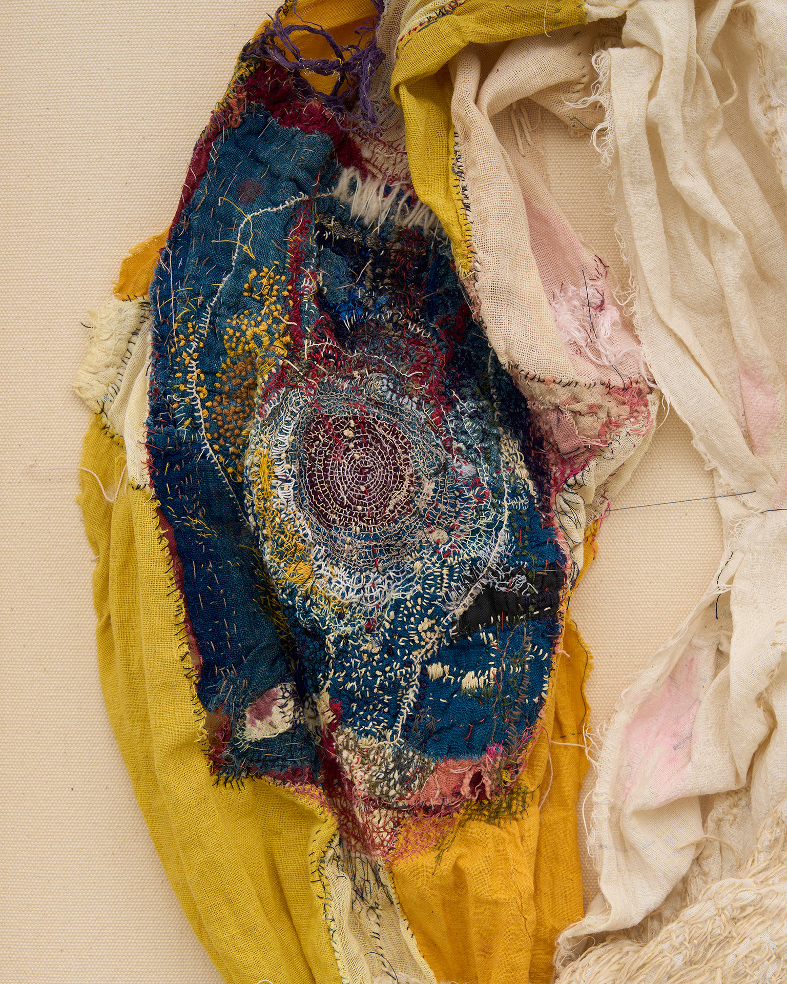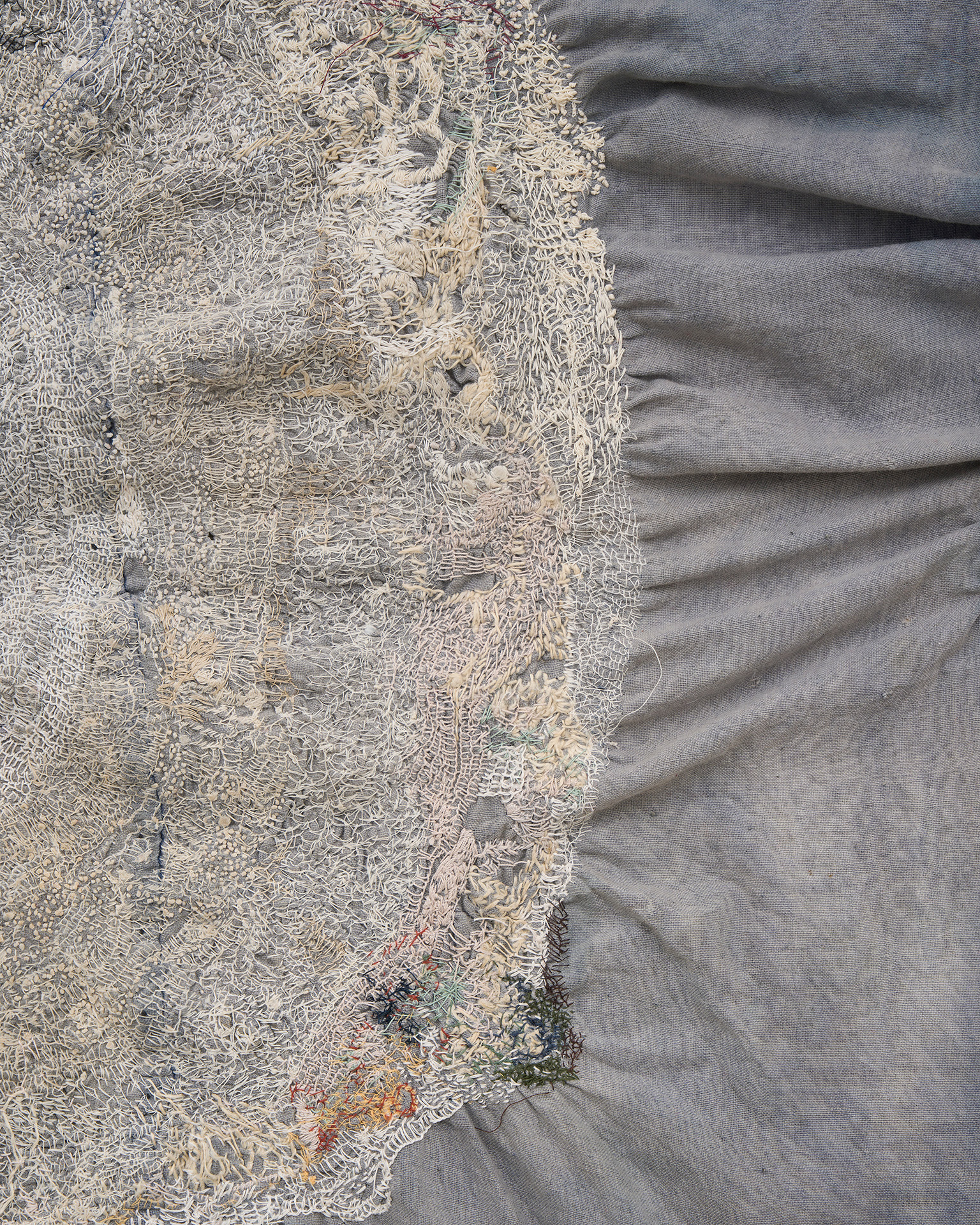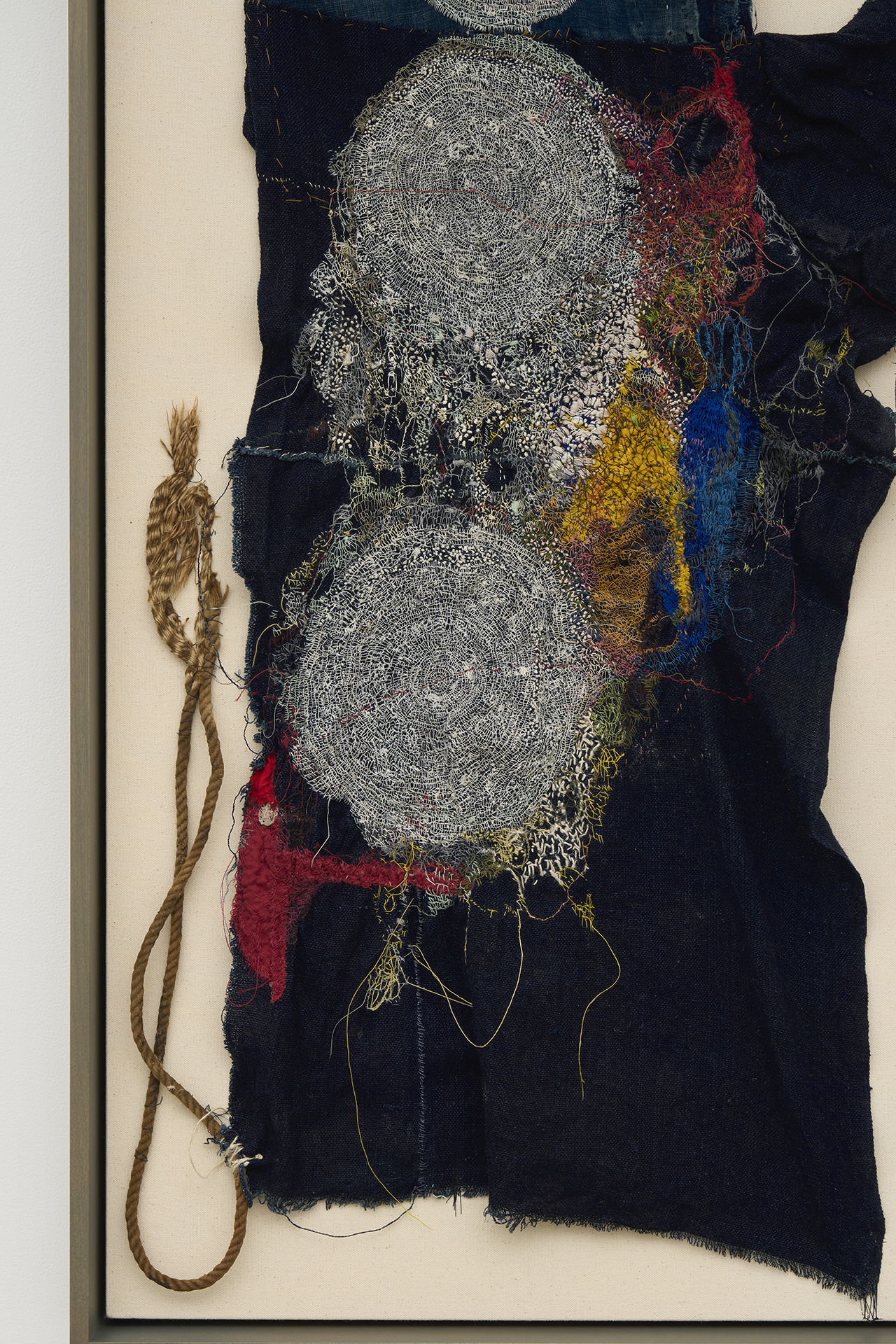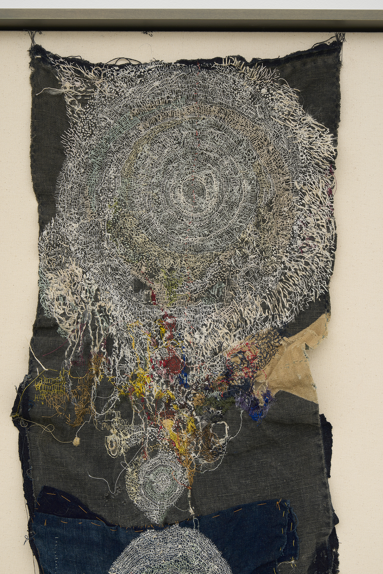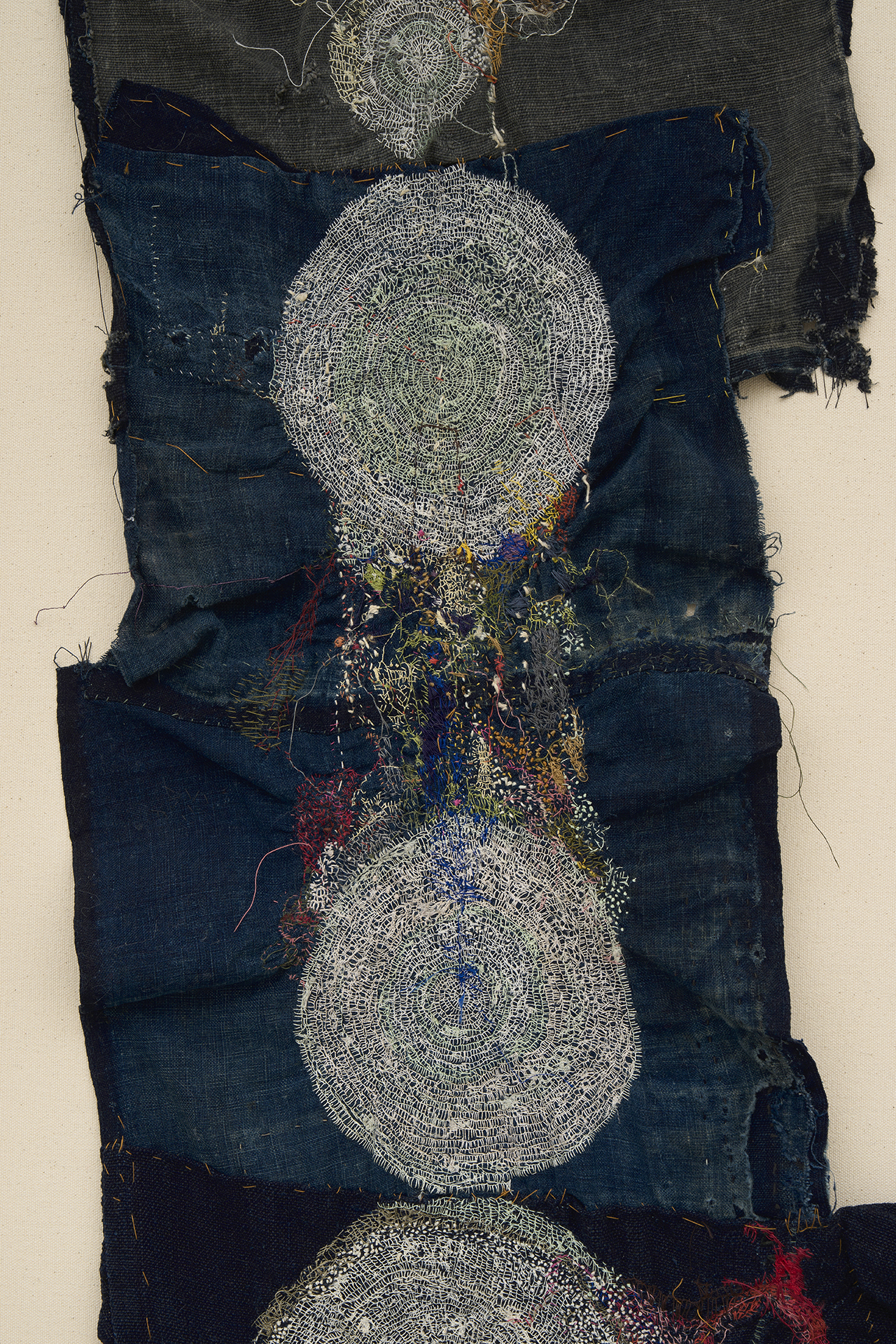 不完全で使い古された素材を扱うには、磨耗や⾊あせを受け⼊れることが必然となり、それは偶然の結び⽬やもつれ、裂け⽬を取り⼊れる沖の刺繍に対する姿勢ともつながっています。彼⼥は、割れた器の破⽚をつなぎ合わせて新しい作品を作る陶芸の「呼継ぎ」や、漆や⾦箔を使って陶磁器を繕う「⾦継ぎ」など、⽇本の伝統的な技法を取り⼊れており、どちらも歴史の継続や既存の物の再利⽤を主張しています。沖は、彼⼥の刺繍を既成のものと「まぜる」ことで、それらの物語を加え、過去と現在の共存を保とうとしています。