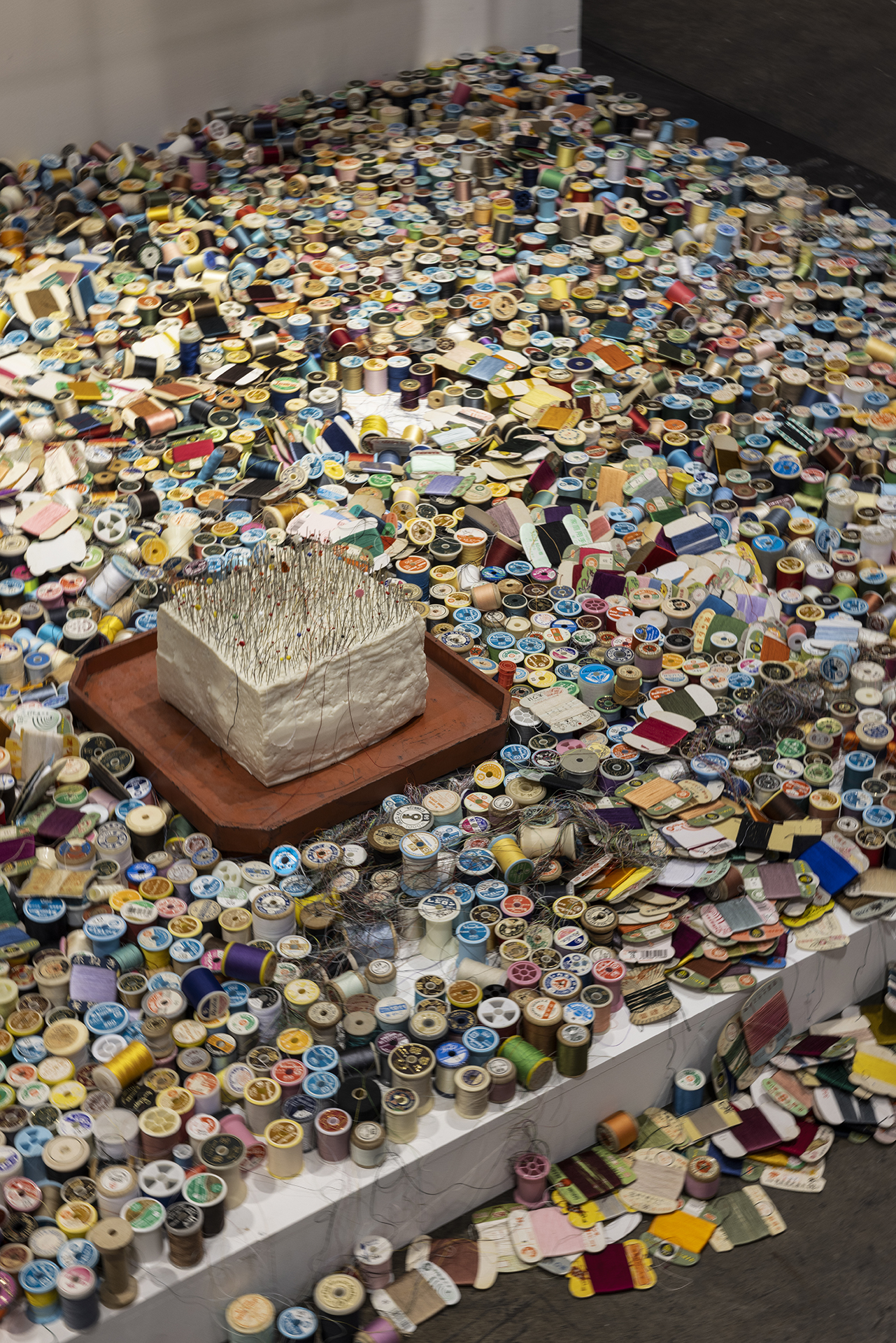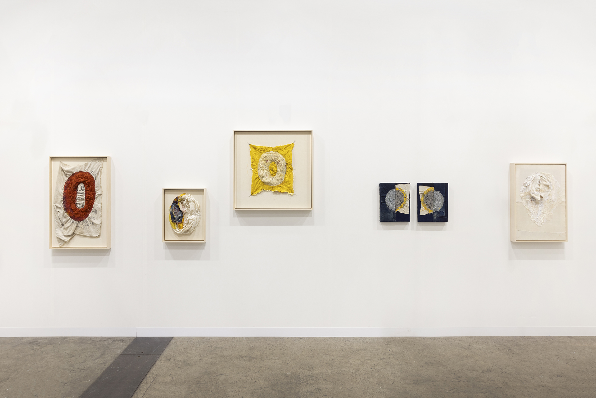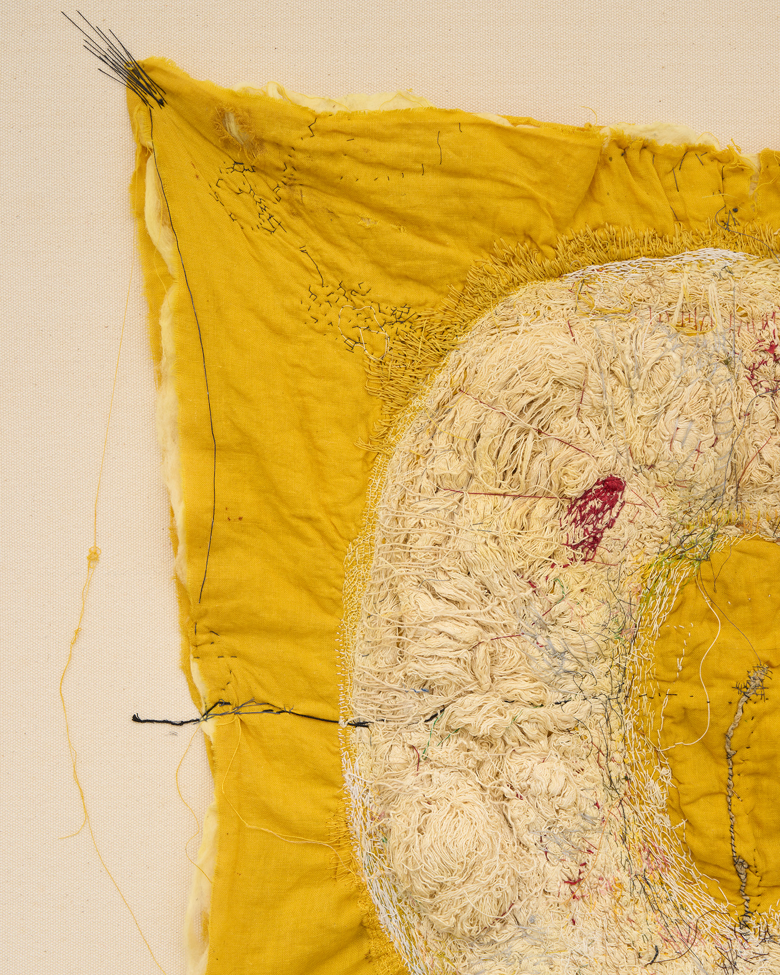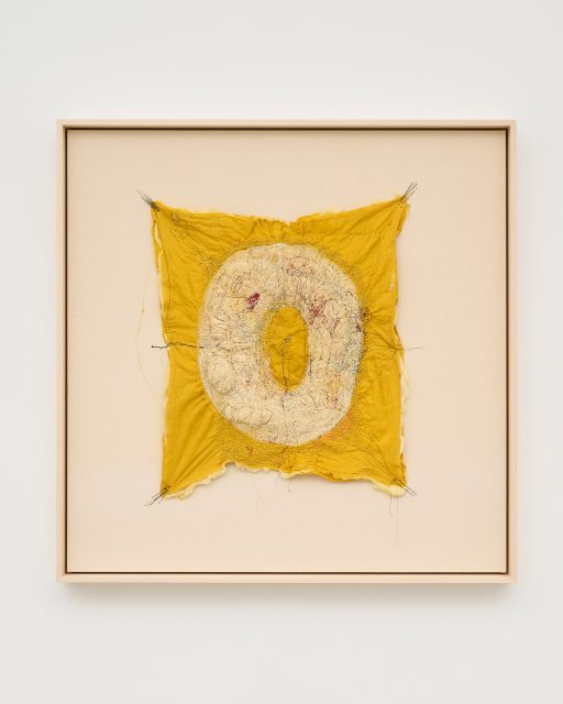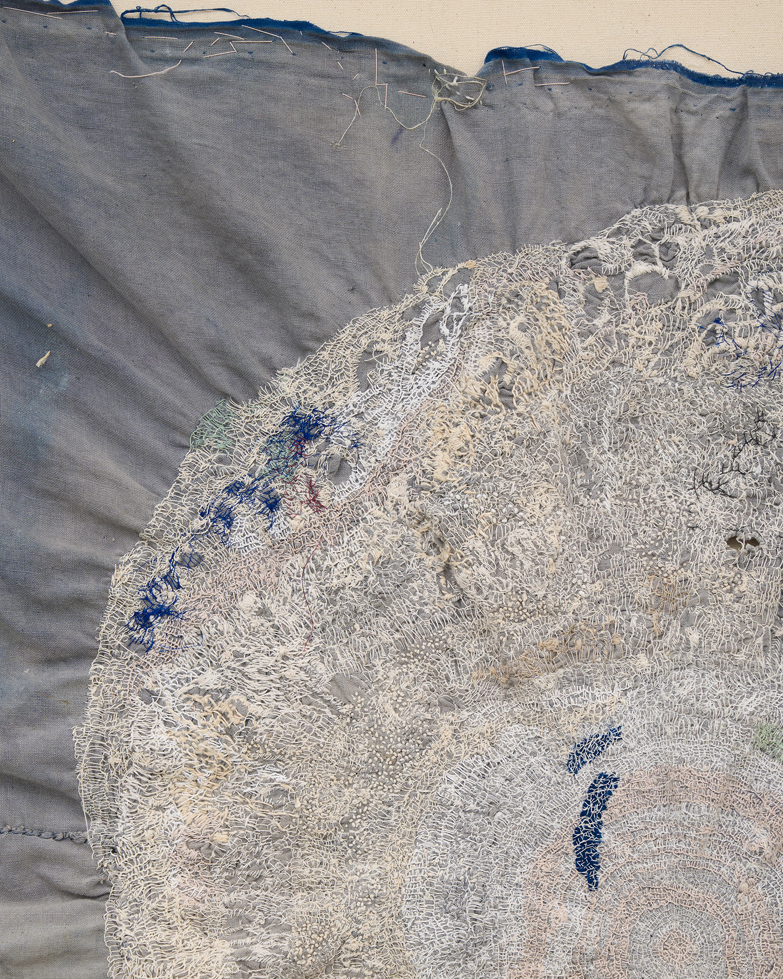 不完全で使い古された素材を扱うには、磨耗や⾊あせを受け⼊れることが必然となり、それは偶然の結び⽬やもつれ、裂け⽬を取り⼊れる沖の刺繍に対する姿勢ともつながっています。彼⼥は、割れた器の破⽚をつなぎ合わせて新しい作品を作る陶芸の「呼継ぎ」や、漆や⾦箔を使って陶磁器を繕う「⾦継ぎ」など、⽇本の伝統的な技法を取り⼊れており、どちらも歴史の継続や既存の物の再利⽤を主張しています。沖は、彼⼥の刺繍を既成のものと「まぜる」ことで、それらの物語を加え、過去と現在の共存を保とうとしています。