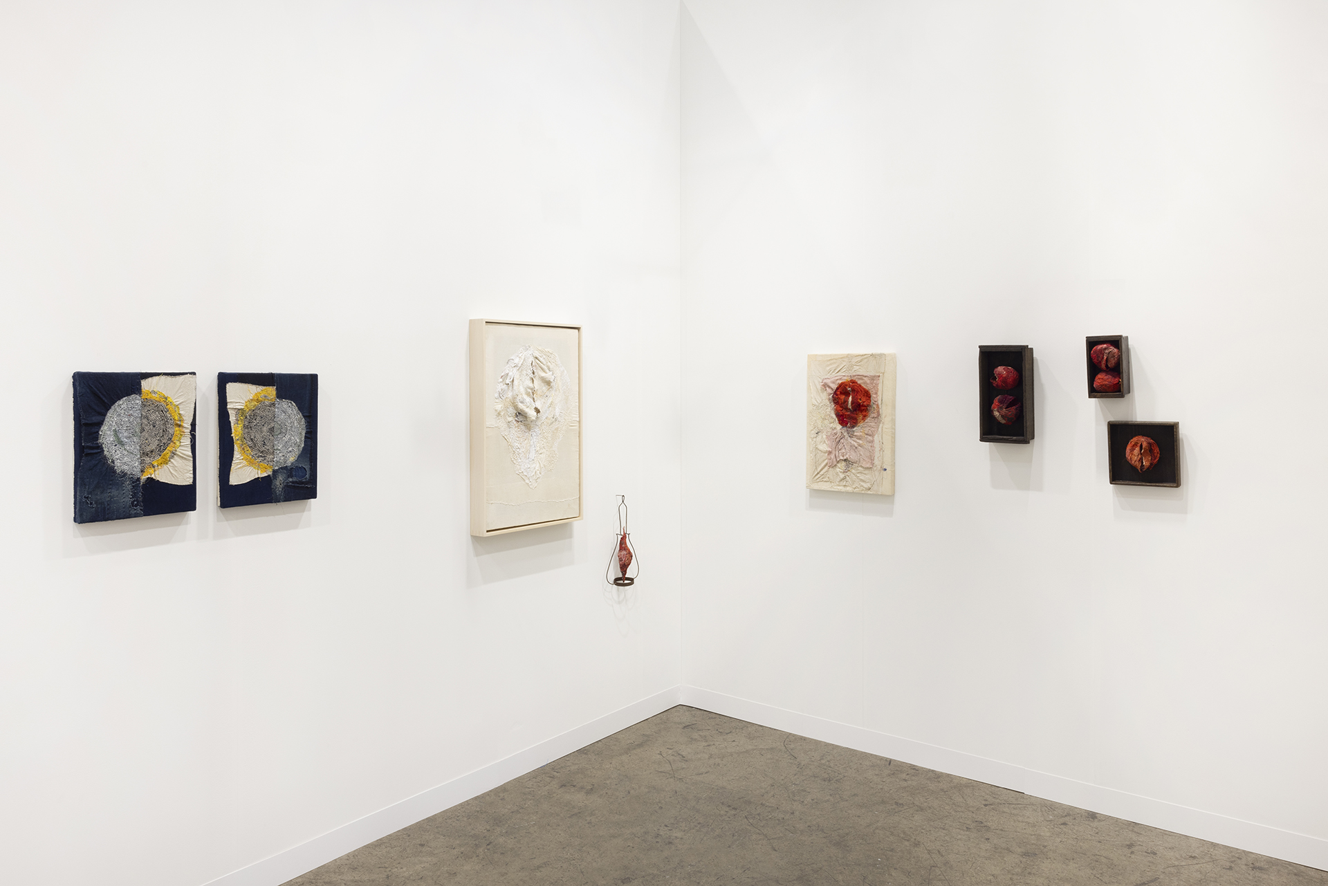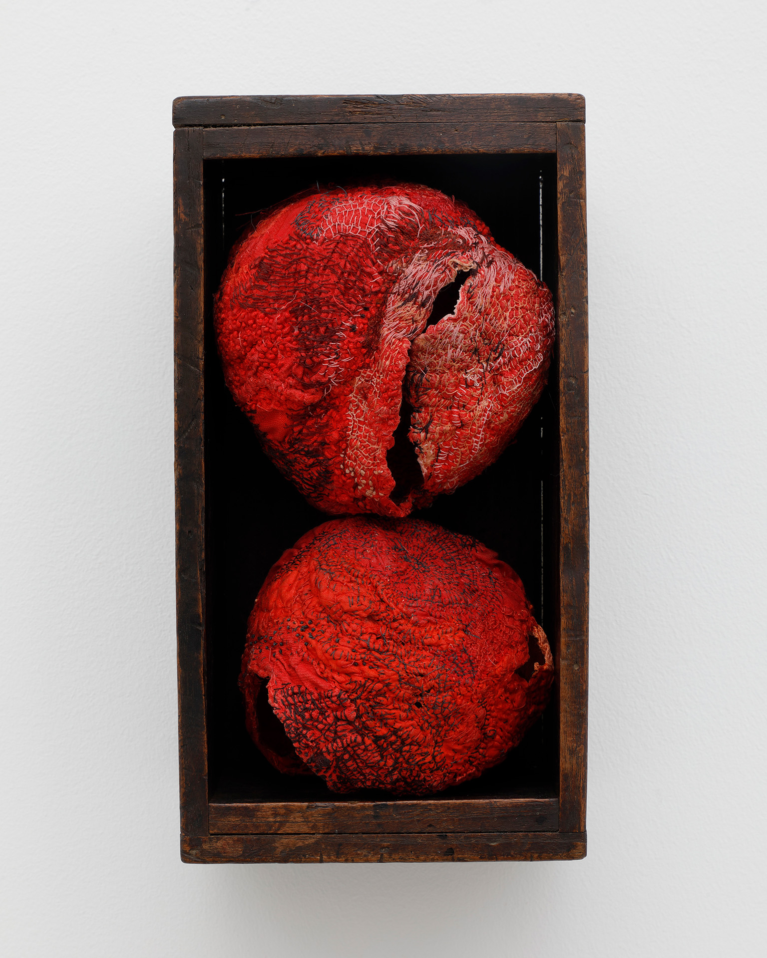 彼⼥の作品はまた、アッサンブラージュの⼿法も取り⼊れており、その素材は、ボロ(繕ったり継ぎ合わせたりした織物)から100年以上前の⾵呂敷、窓枠、⽊製の⾦盥、ヴィンテージのデザイナーズ・ウェアに⾄るまで多岐にわたります。すべての素材に所有者、⽬的、時間性、地域性といった独⾃の物語が必然的に絡み合っており、沖はひとつひとつを⼀期⼀会の出会いとして扱います。これらの物が以前存在していたそれぞれの歴史と年代を慎重につなぎ合わせ、新たな⽣命と意味を持つ器となる作品を創り出します。作品が⽣まれた⽂化的、社会的背景を意識しながらも、彼⼥は個⼈的に素材と作品とつながりを保ち、共感することにこだわり続けています。