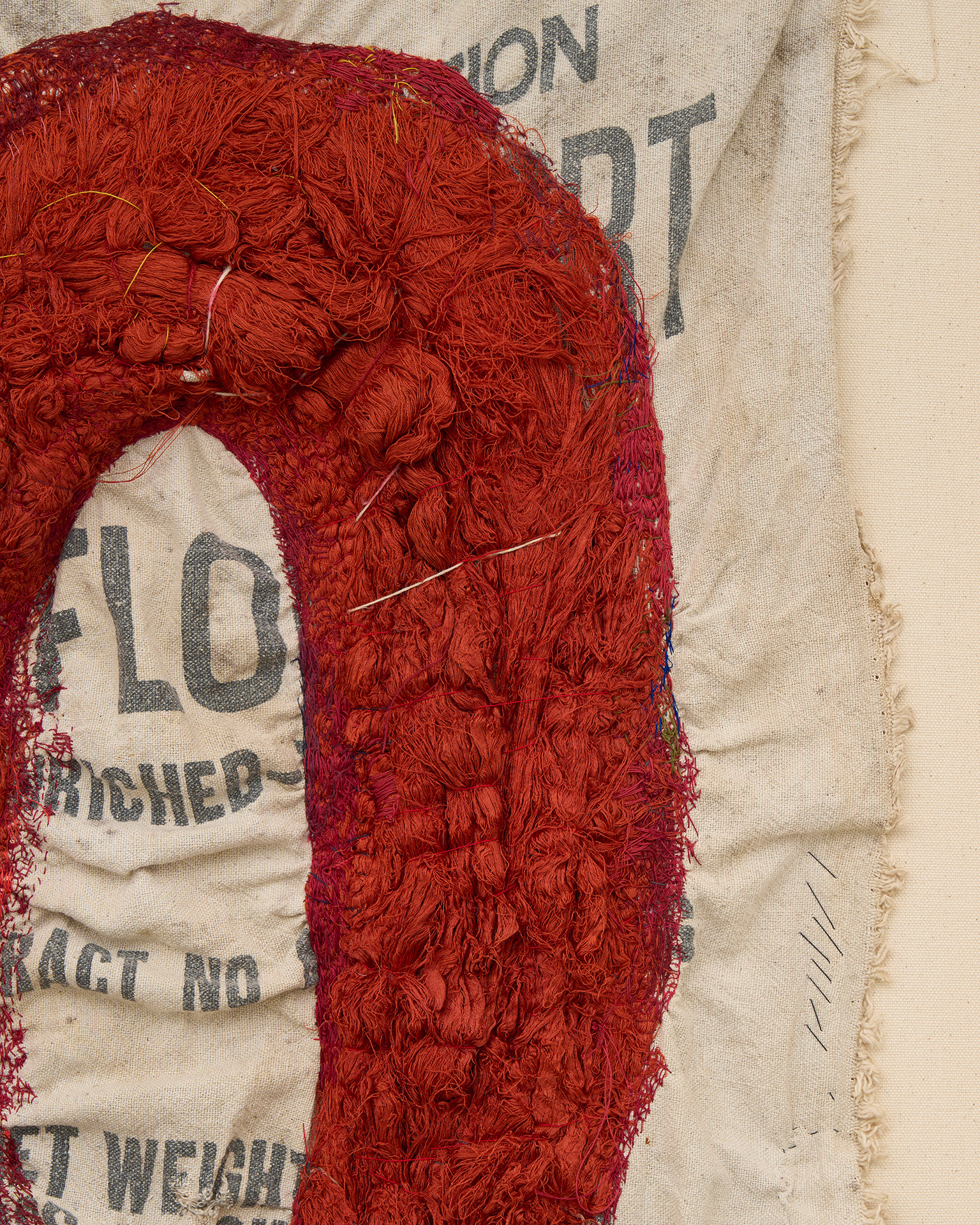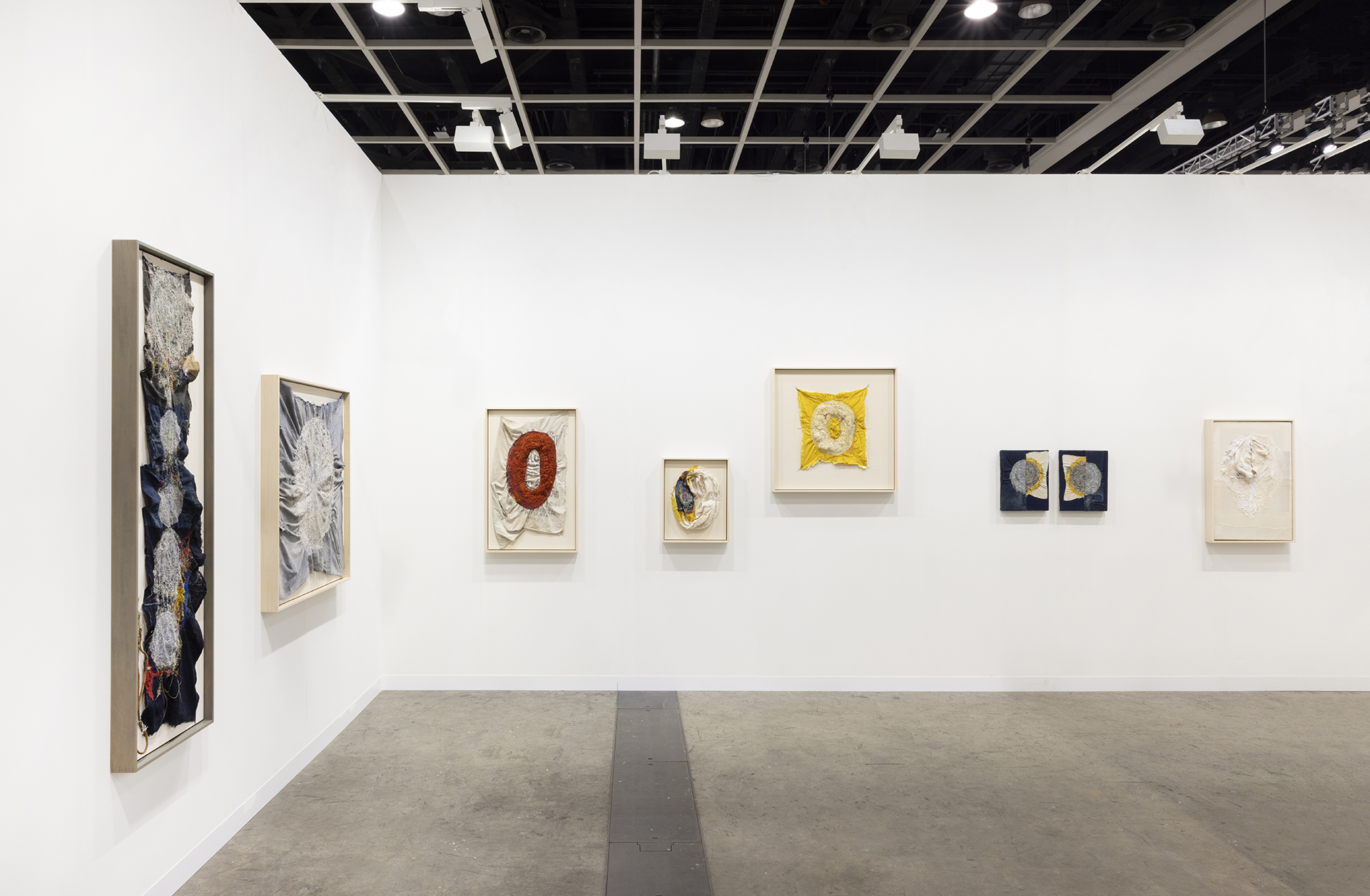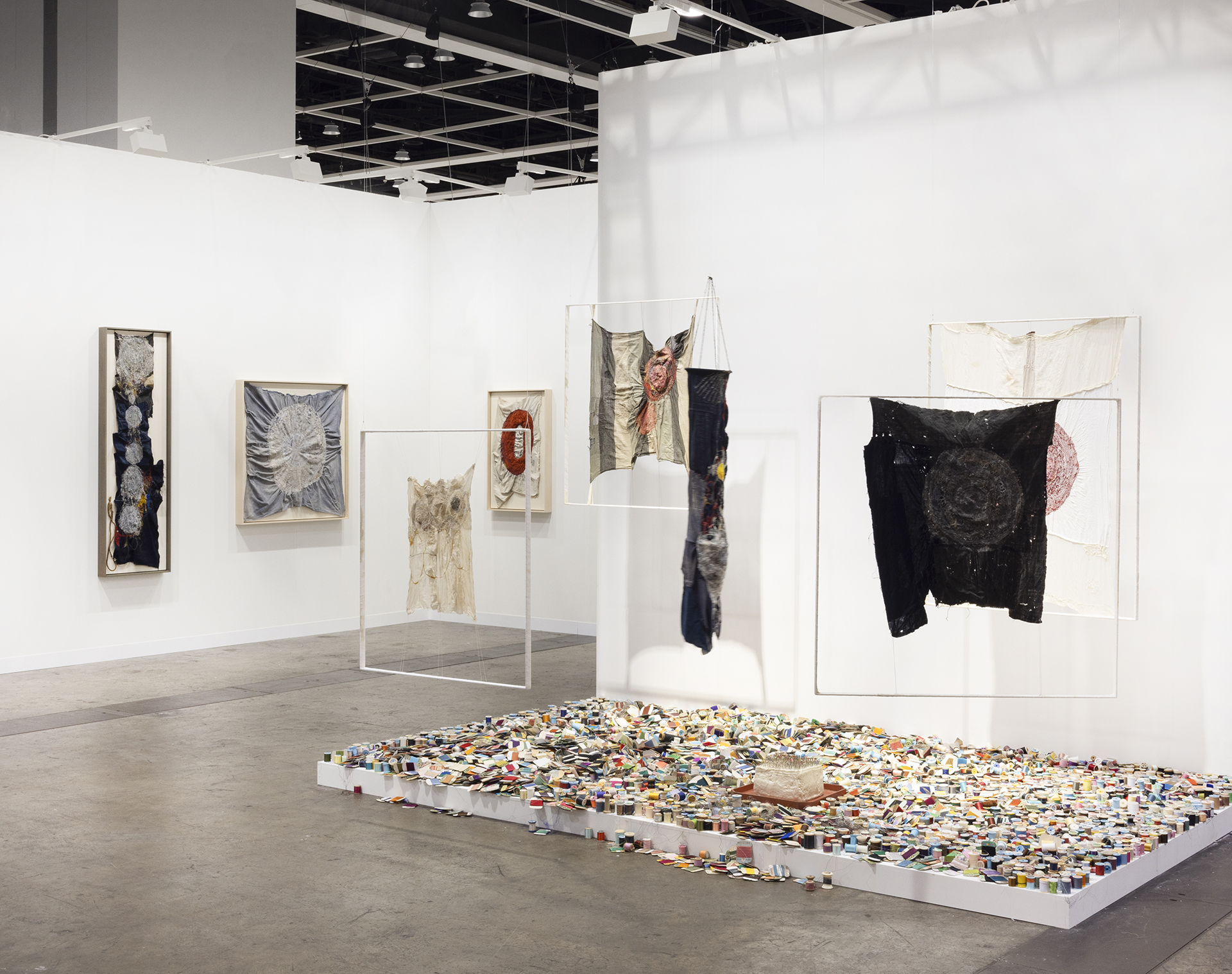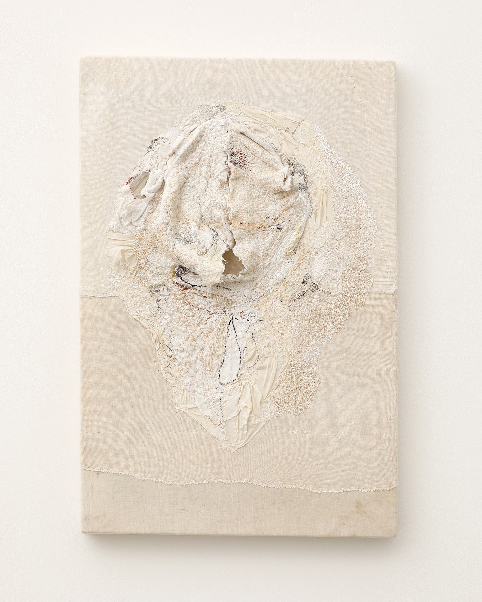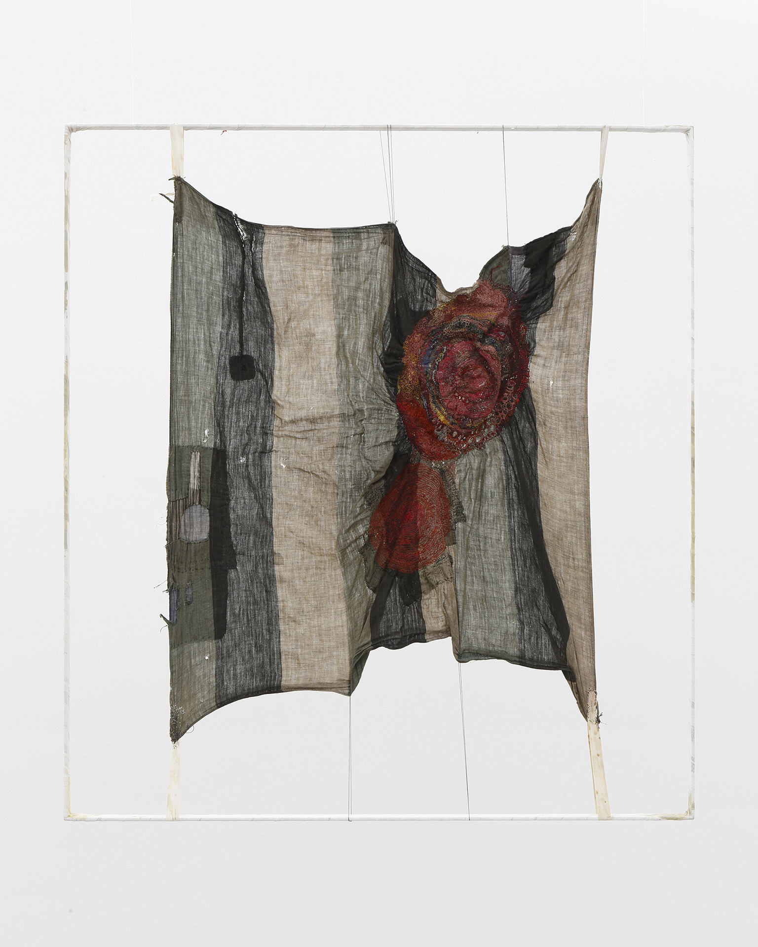 沖潤子は、生命の痕跡を刻み込む作業として布に針目を重ねた作品を制作しています。瞑想的で丹念な沖の制作は、使い古された布、様々な種類の糸、ファウンド・オブジェ、そして彼女自身の作品を用い、刺繍の構造化された慣習を否定しながらも、歴史、年代、物語、感情を縫い合わせるものです。彼女の刺繍は、抽象的なパターン、モチーフ、フォルムを形作り、作風の物質的、感情的な激しさを反映した独自の芸術的アイデンティティを形成しています。