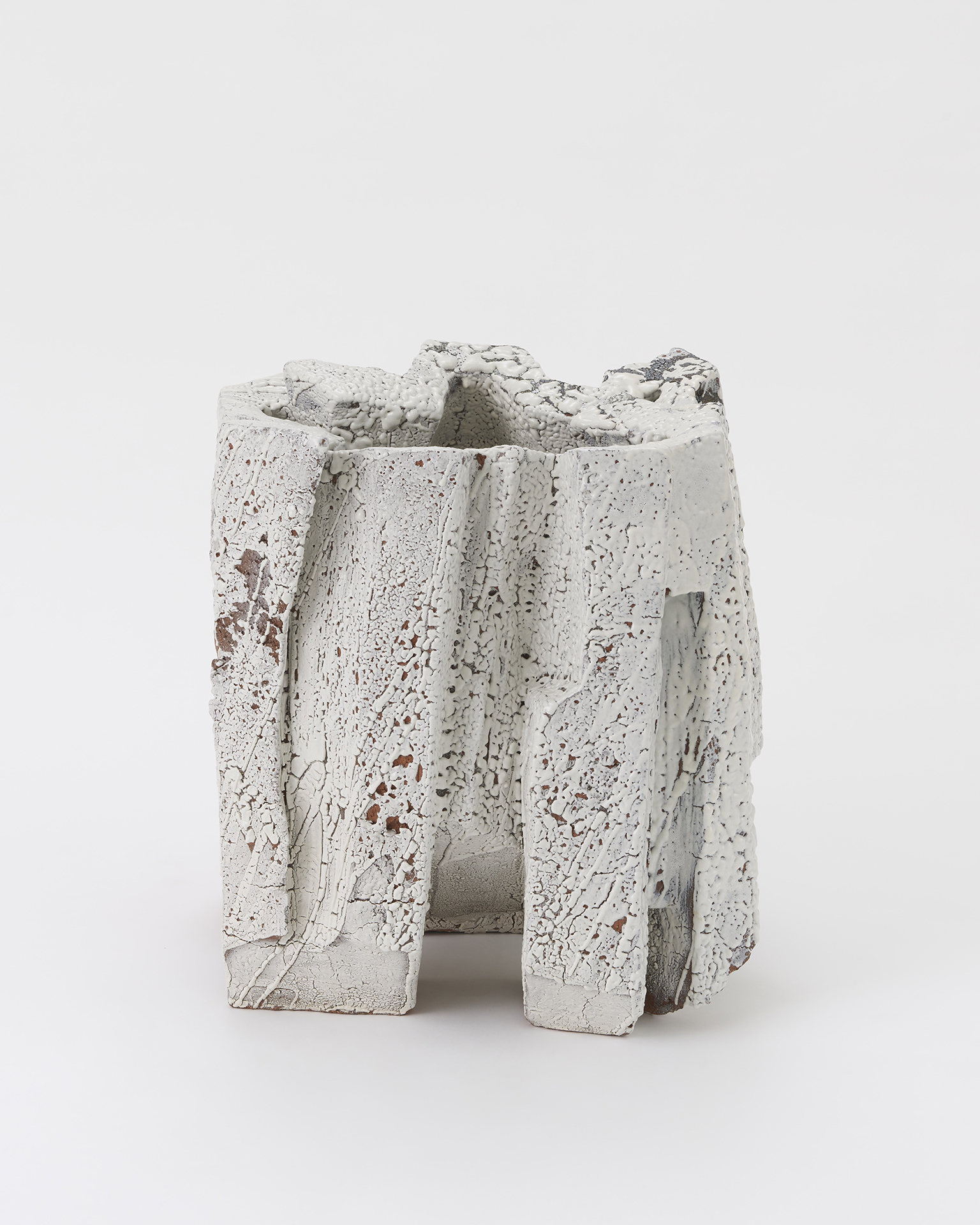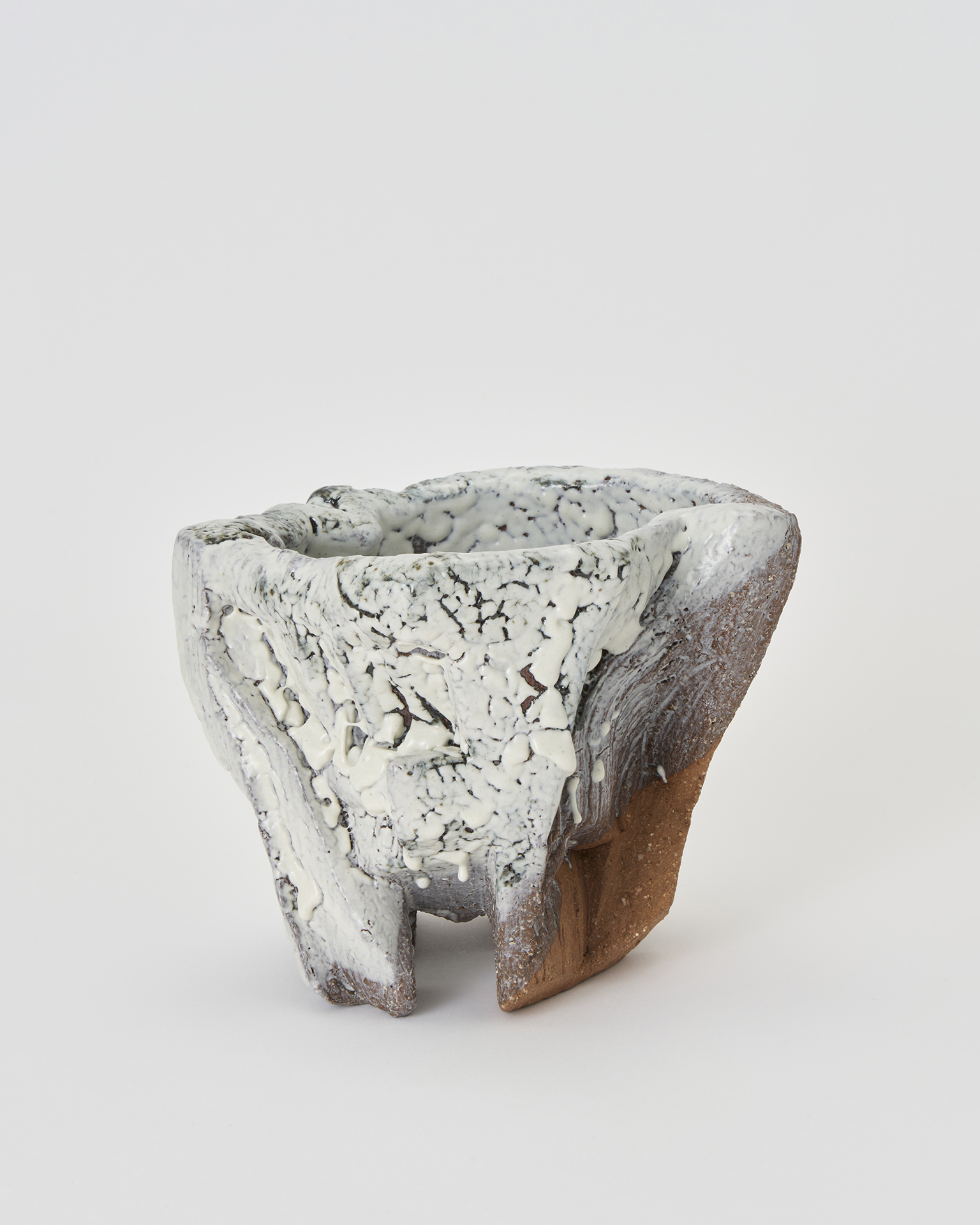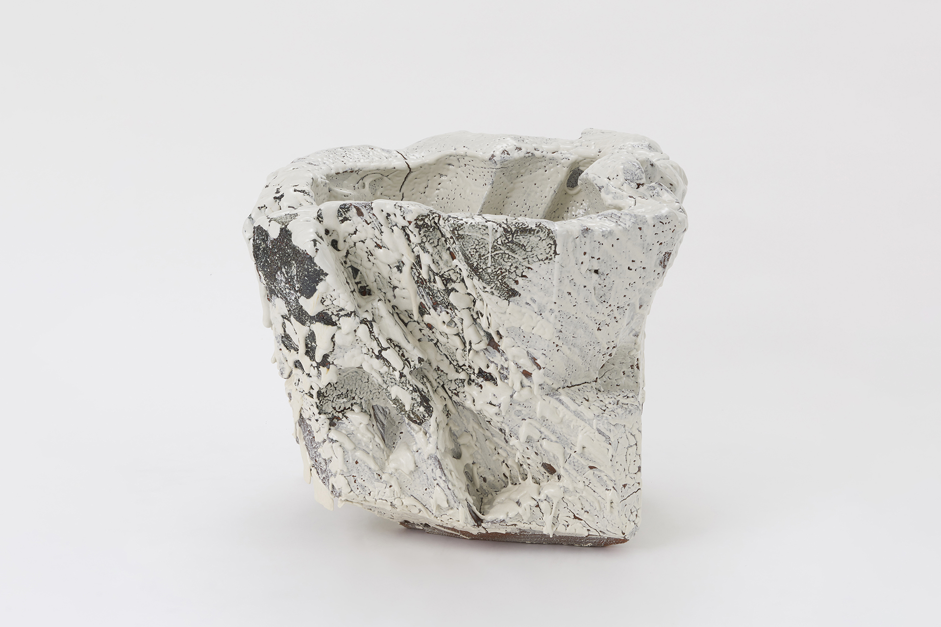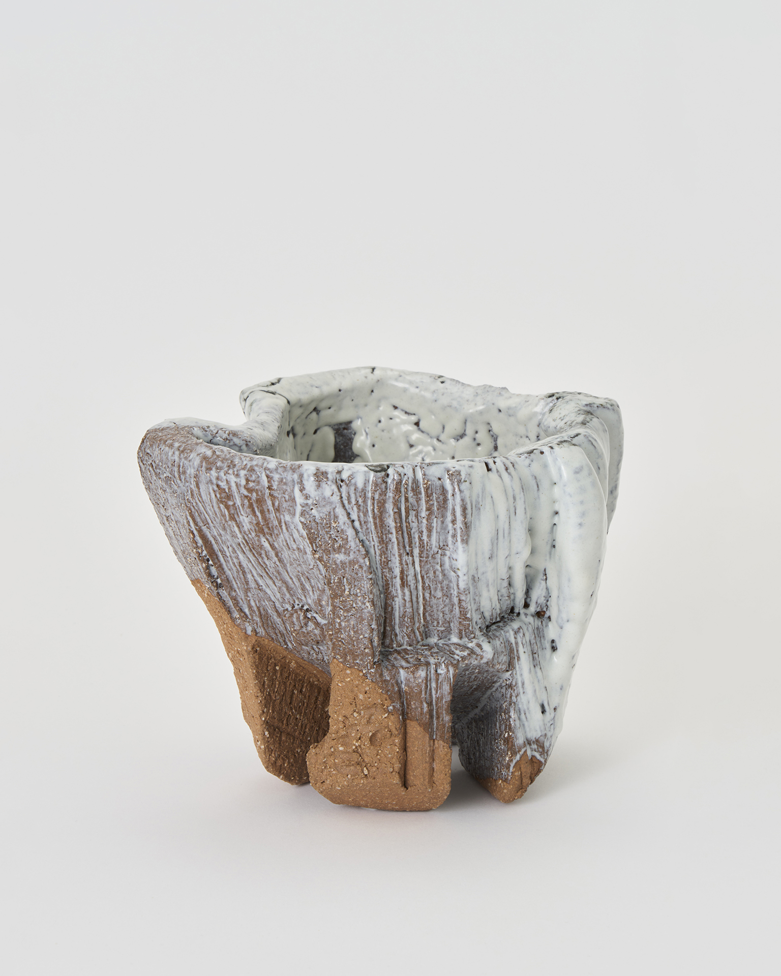 2019年に三輪家当主として十三代 休雪を襲名した三輪休雪は、三輪家伝来の白萩釉を用い、萩焼の伝統を継承しながらもダイナミックで斬新な造形を取り入れた作風で、国内外で高く評価されています。刀を使って斬り出した土肌と三輪家伝来の白萩釉(休雪白)のコントラストで迫る茶碗《エル キャピタン》シリーズは、米国留学時代にヨセミテ国立公園で見た巨大な花崗岩などから得たインスピレーションと広大な大陸の風景の厳しさ、恐ろしさ、そして優しさへの畏怖の感覚を、萩の土、そして陶芸の伝統と統合して作られています。