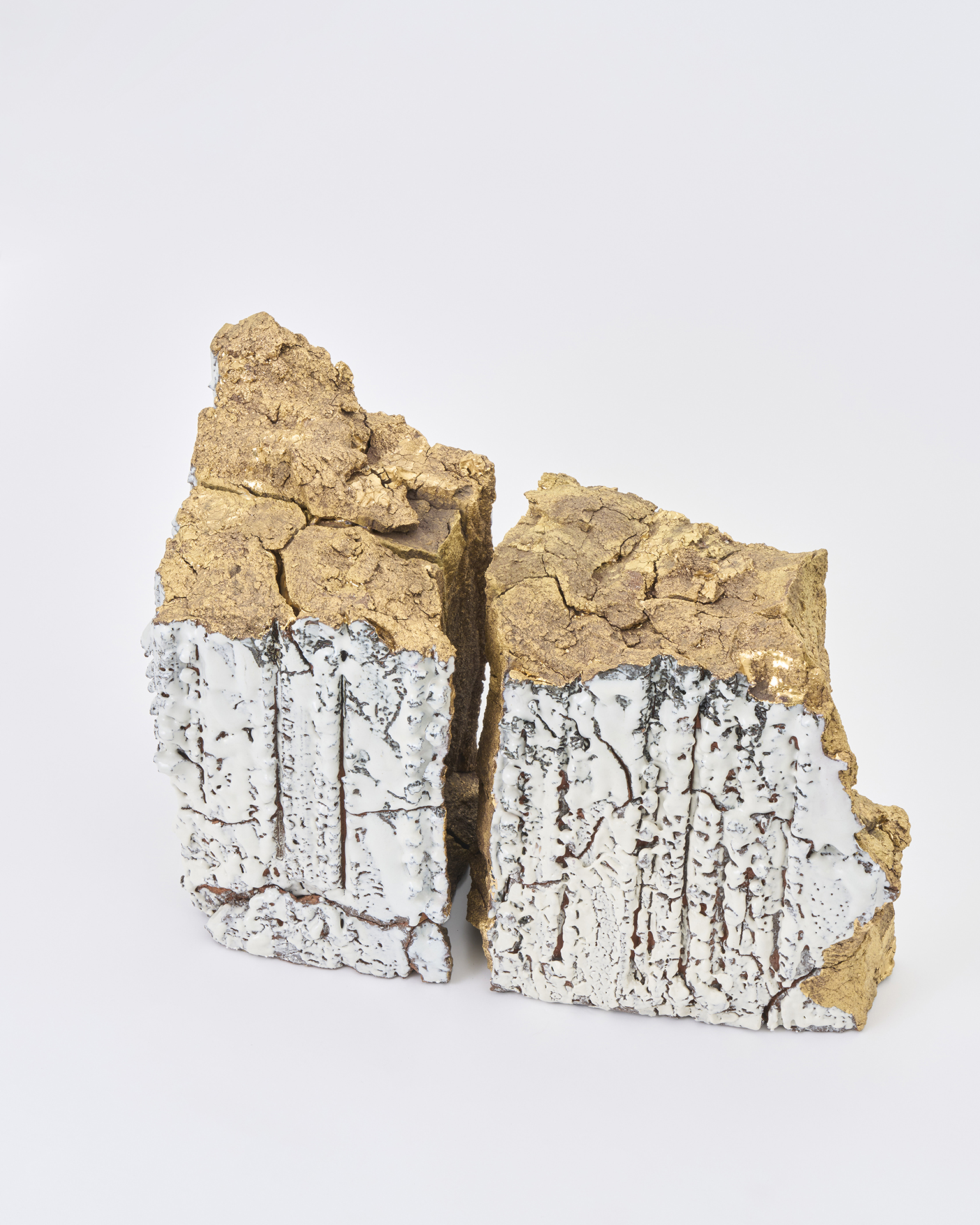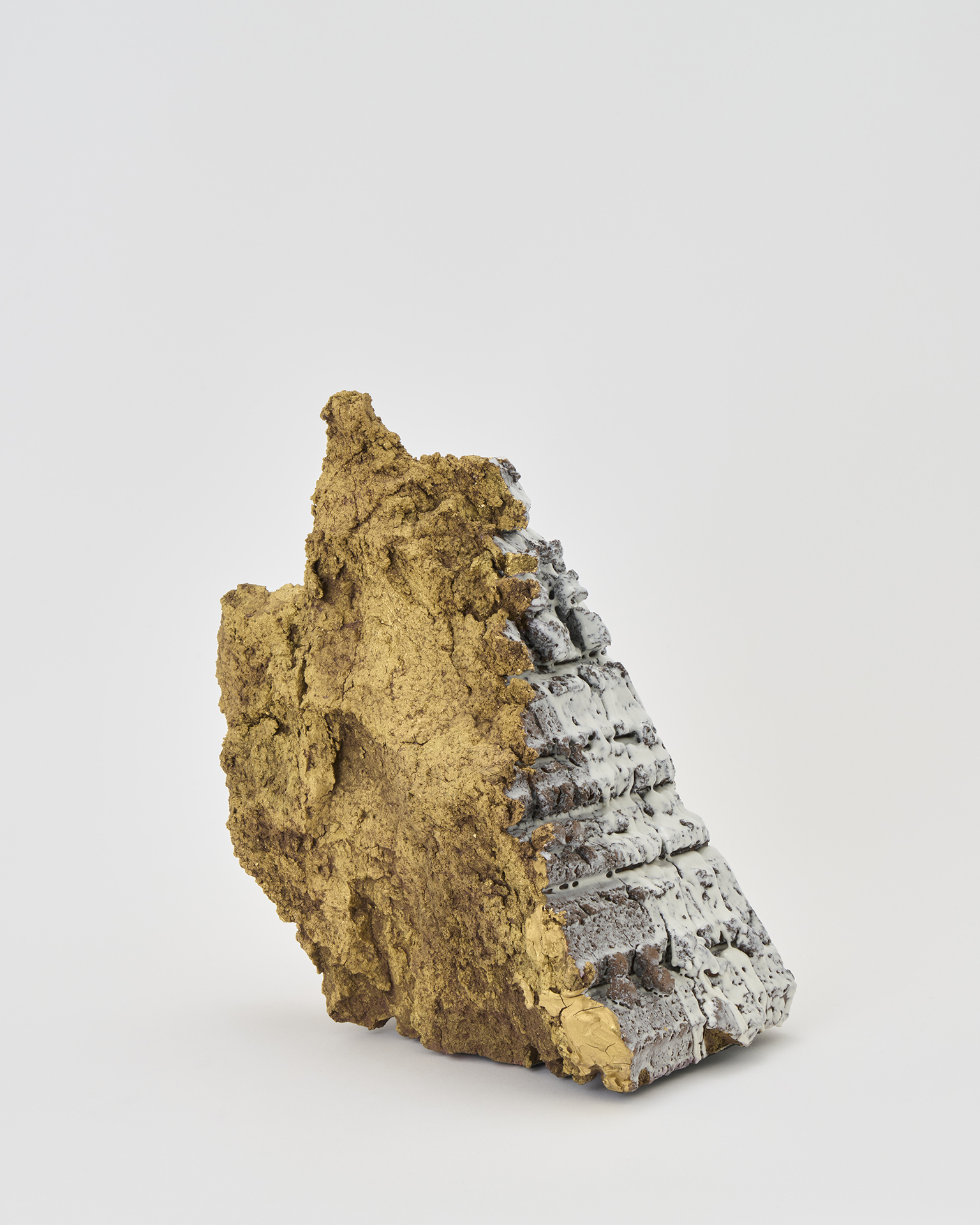 帰国後、彼は土の可能性を探求し続けています。その制作活動の核心には、土を常に大地の一片、ひいては生命の一片として扱うこと、また土の変容へのこだわりがあります。自宅前の田んぼで育む糧としての土、あるいは壁や煉瓦となって守る住処としての土という現実の姿に向き合いながら、彼は繰り返し問い続けます。自然から与えられる要素と人の関わり方、そして一人の人間が有意義に動かし、形作ることができる土について ― たとえそれが実用的なものであれ、そうでないものであれ。今回展示される《エル ドラード》のシリーズは、初期作品における造形とスケールへの実験を再訪した新作であり、大地の一塊から何を創造しうるかという問いへの、三輪の現在の答えです。黄金郷にまつわる伝説を引用しつつ、自然そのものが持つ圧倒的な力と、欲望や貪欲といった人間が翻弄される隠れた感情を同時に喚起しうる性質について、作家は考察を深めています。