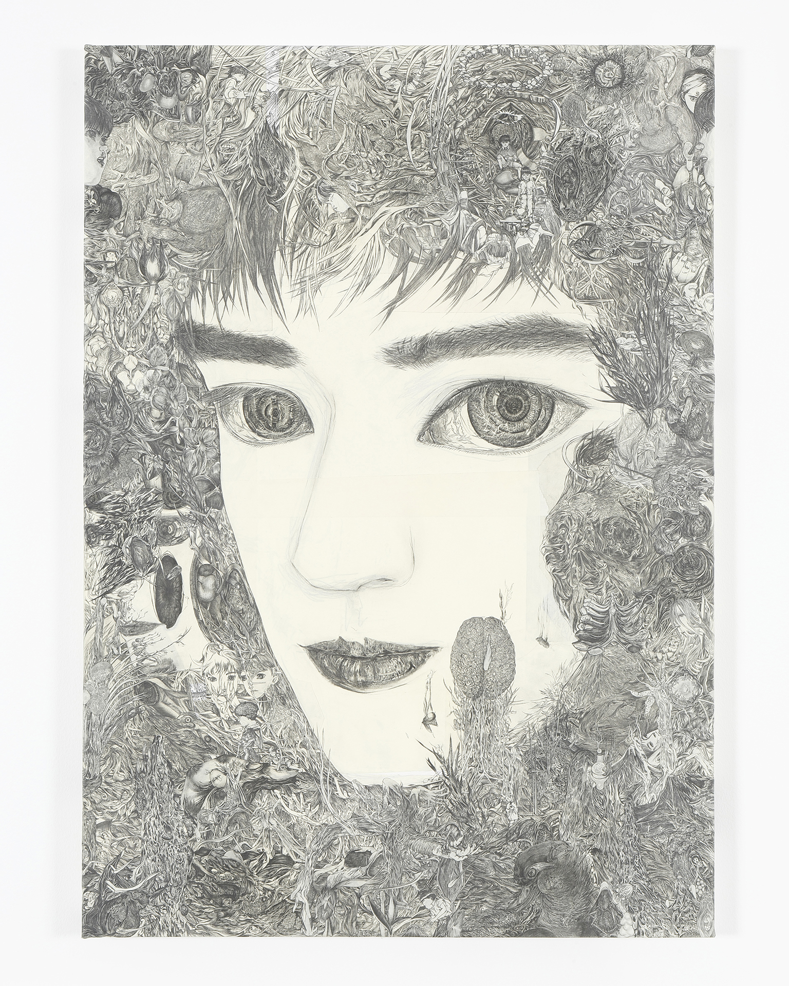 佐藤允は、描くことによって⾃ら、⼈、そして世界を理解しています。過剰ともいえるような緻密な鉛筆の線描写や独特の筆致によって、オブセッション、恐怖、恋愛などを描きます。作品とは⾃分が⾃分のために、⽣きた⼈が⼈のために作り受け取るものだと考える佐藤は、「アートのためのアート」や新しさ、意味を求めることはしません。解らないことは解らないまま考え続けていくことを原動⼒とするからこそ、彼のイメージは増殖していきます。パーソナルな問いから⽣まれた佐藤の作品は、強いエネルギーで鑑賞者の内部にも⼊り込んでいきます。