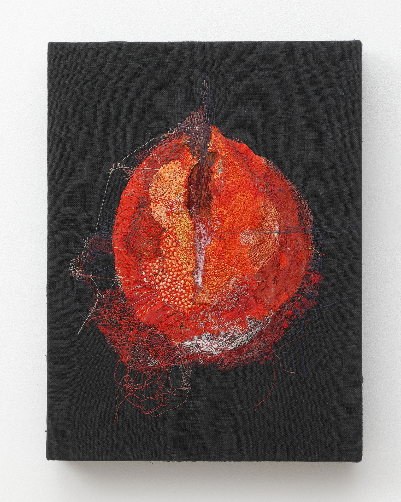 沖潤⼦は、⽣命の痕跡を刻み込む作業として布に針⽬を重ねた作品を制作しています。下絵を描く事なしに直接布に刺していく独⾃の⽂様は、シンプルな技法でありながら「刺繍」という認識を裏切り、観る者の根源的な感覚を⽬覚めさせます。古い布や道具が経てきた時間、またその物語の積み重なりに、彼⼥⾃⾝の時間の堆積をも刻み込み紡ぎ上げることで、新たな⽣と偶然性を孕んだ作品を⽣み出します。存在してきたすべてのもの、過ぎ去ったが確かにあった時間。いくつもの時間の層を重ねることで、違う⾵景を⾒つけることが制作の核にあります。