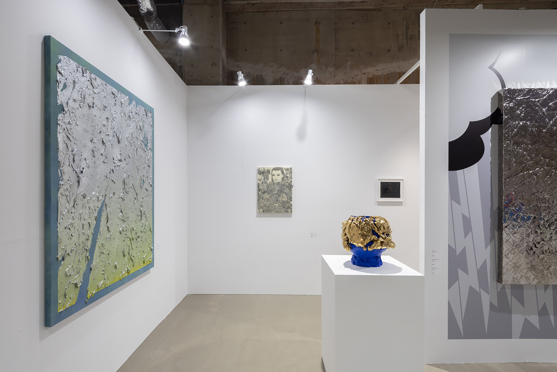 沖潤⼦は、⽣命の痕跡を刻み込む作業として布に針⽬を重ねた作品を制作しています。下絵を描く事なしに直接布に刺していく独⾃の⽂様は、シンプルな技法でありながら「刺繍」という認識を裏切り、観る者の根源的な感覚を⽬覚めさせます。古い布や道具が経てきた時間、またその物語の積み重なりに、彼⼥⾃⾝の時間の堆積をも刻み込み紡ぎ上げることで、新たな⽣と偶然性を孕んだ作品を⽣み出します。存在してきたすべてのもの、過ぎ去ったが確かにあった時間。いくつもの時間の層を重ねることで、違う⾵景を⾒つけることが制作の核にあります。