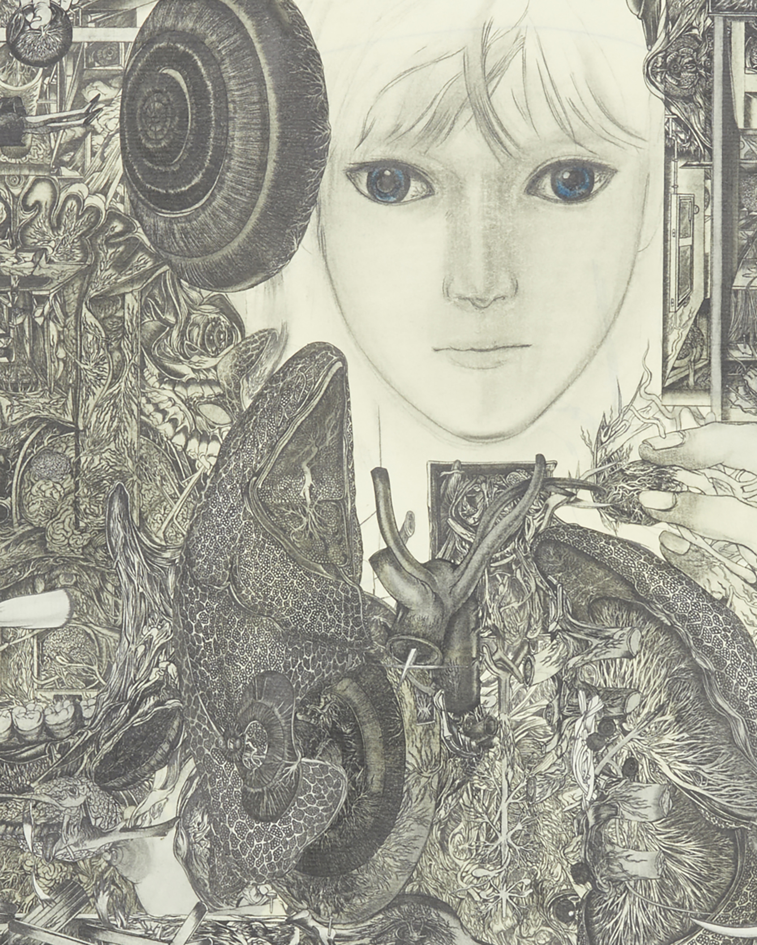 佐藤允は、描くことによって⾃ら、⼈、そして世界を理解しています。過剰ともいえるような緻密な鉛筆の線描写や独特の筆致によって、オブセッション、恐怖、恋愛などを描きます。作品とは⾃分が⾃分のために、⽣きた⼈が⼈のために作り受け取るものだと考える佐藤は、「アートのためのアート」や新しさ、意味を求めることはしません。解らないことは解らないまま考え続けていくことを原動⼒とするからこそ、彼のイメージは増殖していきます。パーソナルな問いから⽣まれた佐藤の作品は、強いエネルギーで鑑賞者の内部にも⼊り込んでいきます。