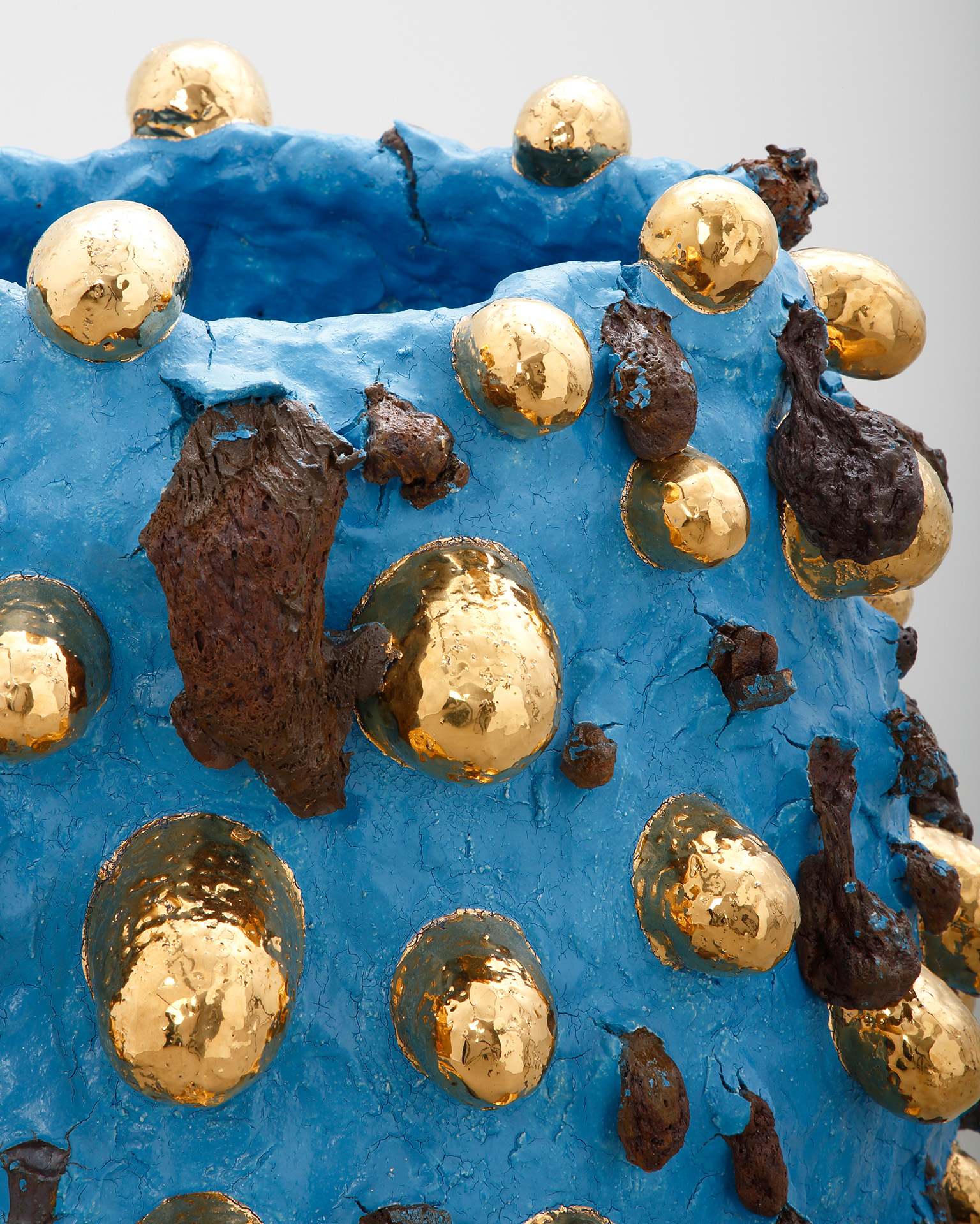 桑⽥卓郎はこれまでに⽬にしたことのない、陶芸の枠を超える表現を発表し続けています。「梅華⽪」や「⽯爆」などの伝統的な陶芸の技術を独創的に表現する桑⽥の新しい視覚⾔語は、世界で⾼い評価を得ています。その核となる伝統表現は桑⽥がスタジオを構える美濃地⽅で⽣まれ、安⼟桃⼭時代に茶の湯の⽂化と共に脈々と継承されてきた“わびさび”や⾃然、不完全なものに美を⾒出した⽇本独⾃の陶芸美学です。桑⽥はその表現を現代に置き換え、場所、歴史や⾃然、時代と対話をし続けることによって、伝統とコンテンポラリーを融合させ、また時には相互に刺激し挑発し合うような、他に類を⾒ないオリジナルな作品を⽣み出しています。
