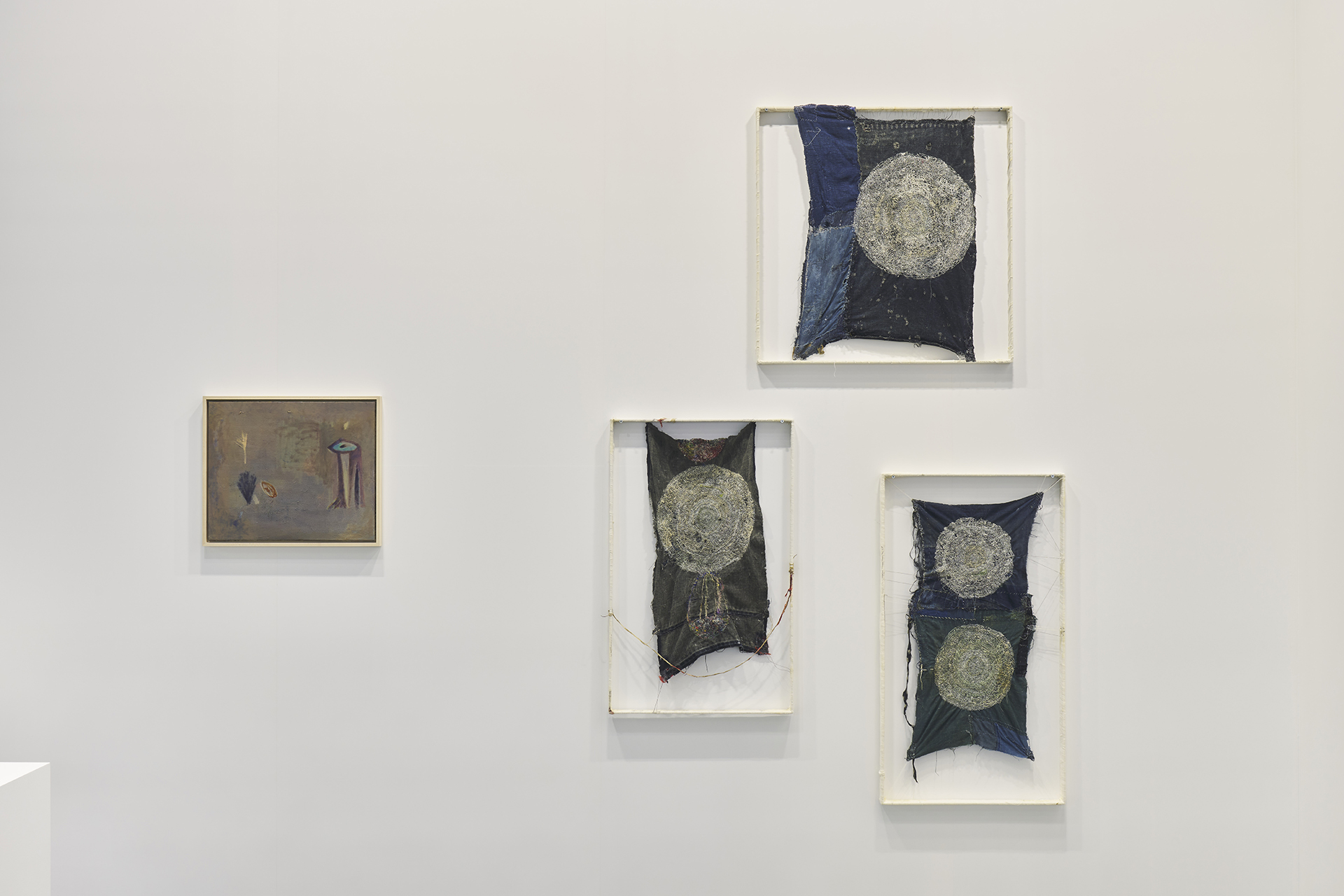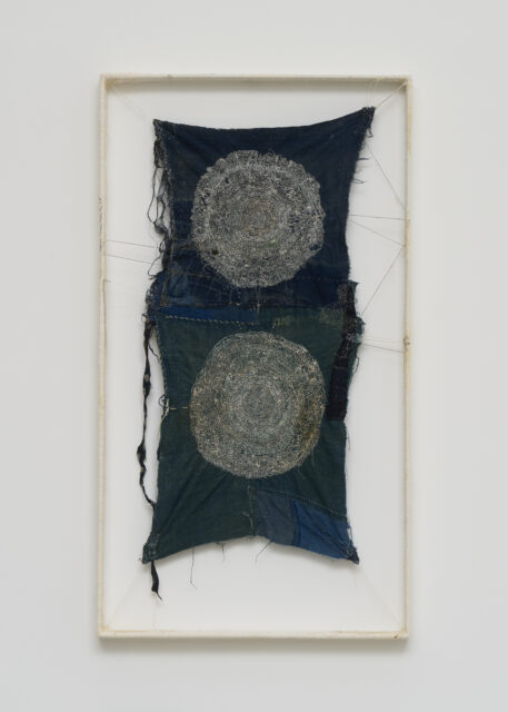 沖潤子は、⽣命の痕跡を刻み込む作業として布に針⽬を重ねた作品を制作しています。下絵を描く事なしに直接布に刺していく独自の⽂様は、シンプルな技法でありながら「刺繍」という認識を裏切り、観る者の根源的な感覚を⽬覚めさせます。古い布や道具が経てきた時間、またその物語の積み重なりに、彼⼥自⾝の時間の堆積をも刻み込み紡ぎ上げることで、新たな⽣と偶然性を孕んだ作品を⽣み出します。存在してきたすべてのもの、過ぎ去ったが確かにあった時間。いくつもの時間の層を重ねることで、違う⾵景を見つけることが制作の核にあります。